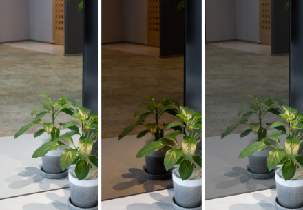 左から標準色の「クリア」、深みのあるニュアンスカラー「ブラウン」、そして新設定されたクールな「グレー」