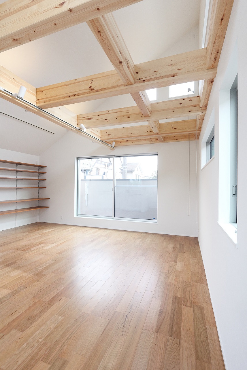 低層エリアでリビングを2Fに配置すると、思い切った勾配天井や吹抜けが造れます。