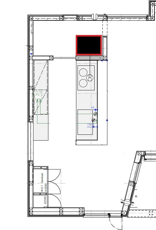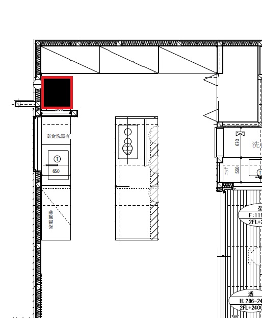 冷蔵庫の前に小壁を設け、正面からの視線をカット。