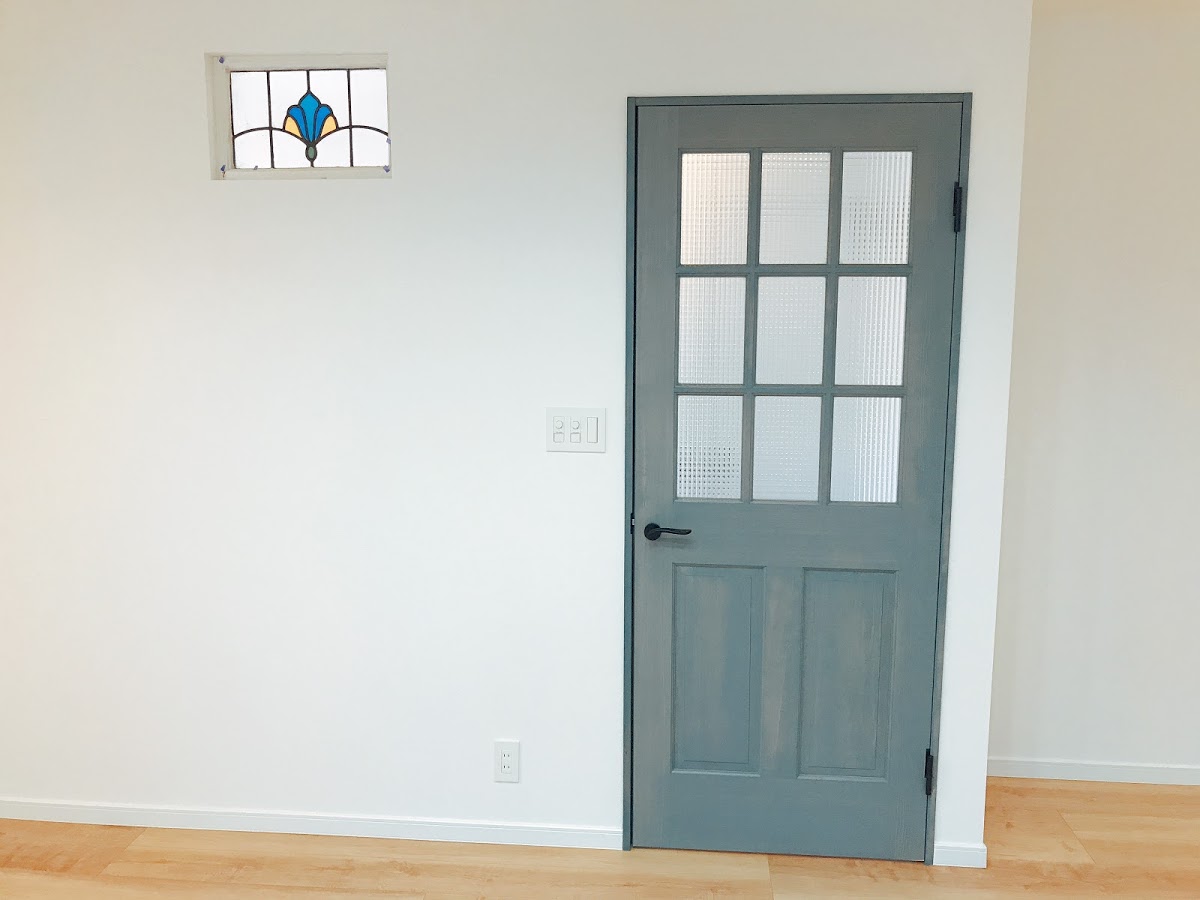 リビングドアはイーストヘムロックの木製ドア。壁に埋め込んであるのはヴィンテージのステンドグラス。
