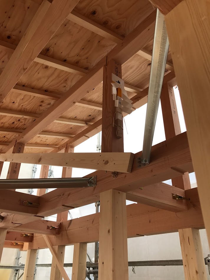 お施主様のご指示に従いながら、建物の一番高い束に正しい方向に向けて取付けし、下りてきてからお施主様がお祈りして、終わったら一回取外して、屋根が完全に上がったら最終取付けという段取りです。お施主様もかなり細かく神社さんのご指示を聞いてこられていて、順番通り正しくやらないといけないので少し緊張したご様子でした。
