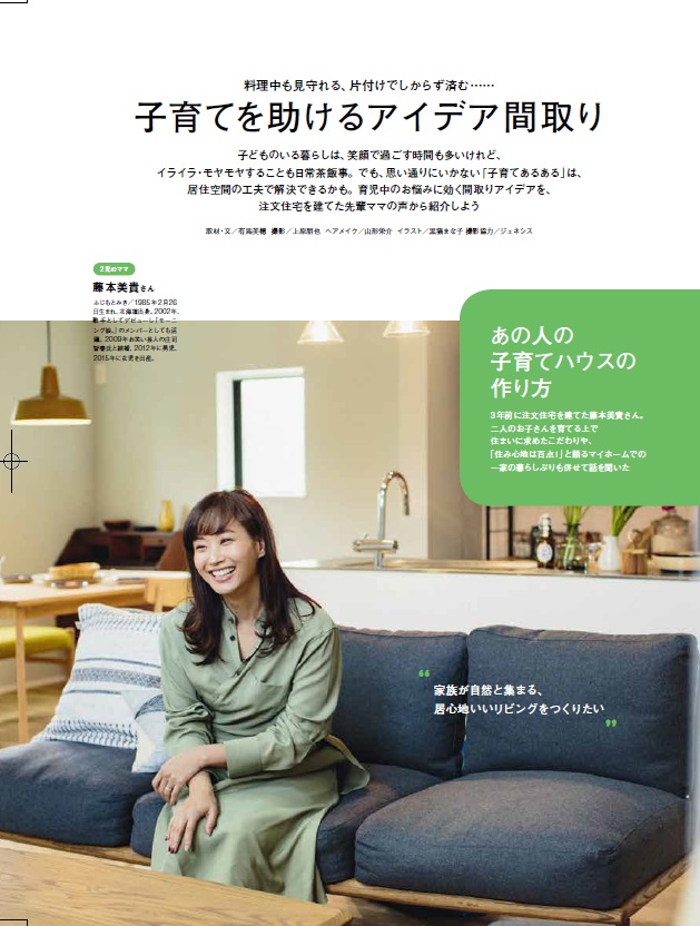 P234の「子育てを助けるアイデア間取り」という特集で藤本美貴さん(ミキティ―!!)がインタビューを受けている家、これが当社の「世田谷モデルハウス」なのです。