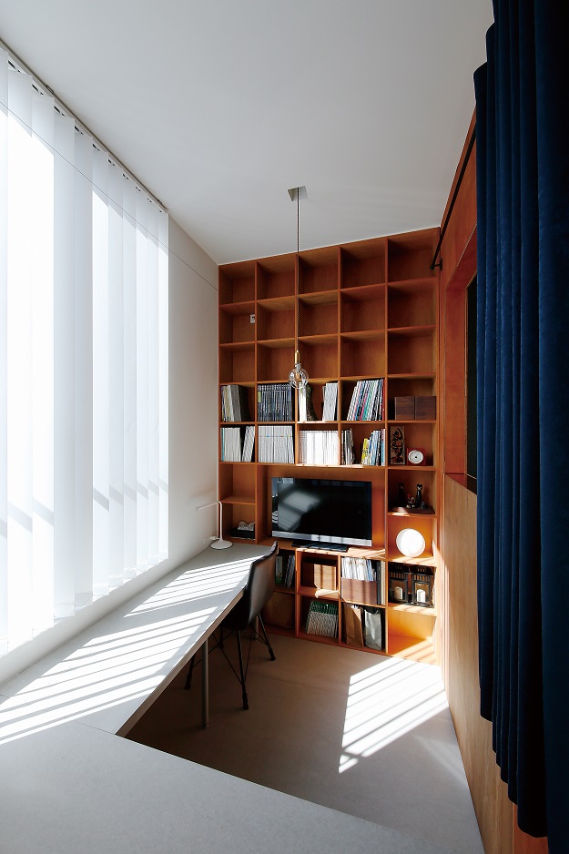 棚を造作して、窓に向かってカウンターを設置したバージョン。書斎というとうす暗い雰囲気を想像しがちですが、ご覧の通りの明るいスペースになっていてきもちよく仕事ができそうです。