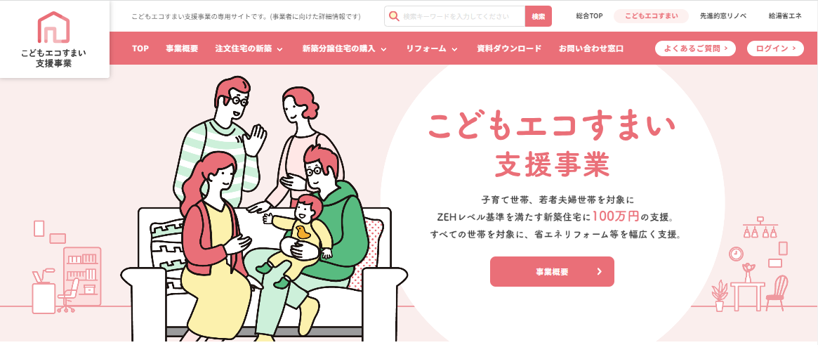 子育て世帯または若者夫婦世帯が、こどもエコすまい支援事業者と契約し、高い省エネ性能(ZEHレベル)を有する住宅を新築する場合、1戸あたり100万円の補助金が国から出るというもの。