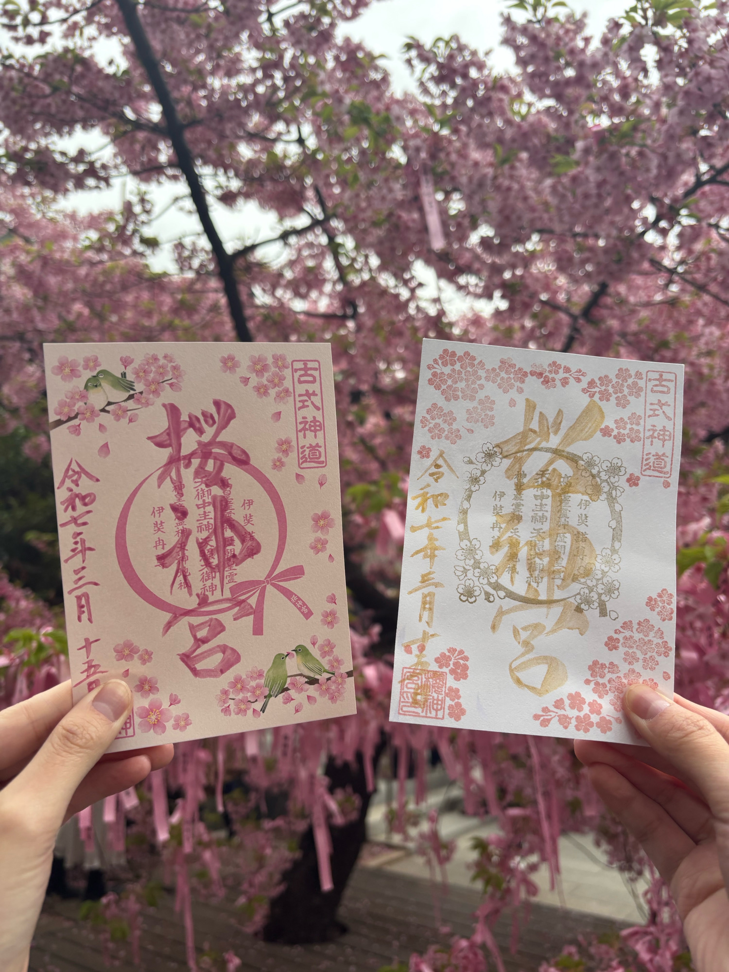 河津桜がとても綺麗でした!この時期限定の春らしいデザインの御朱印ももらってきました✨