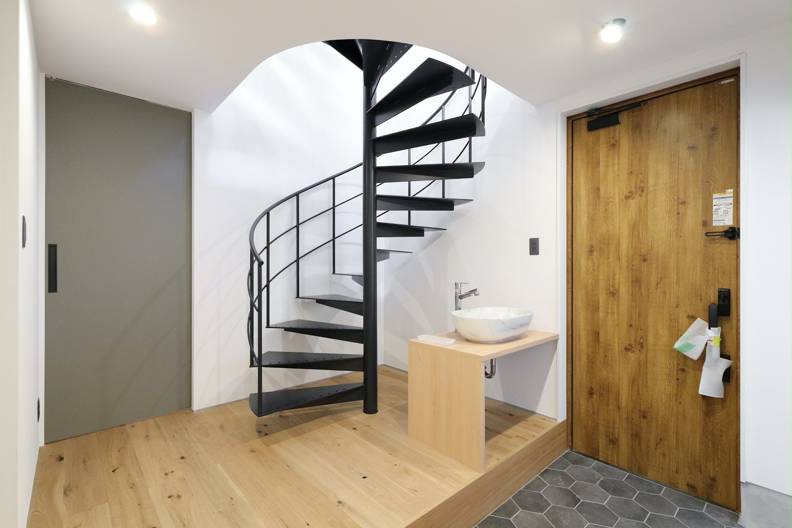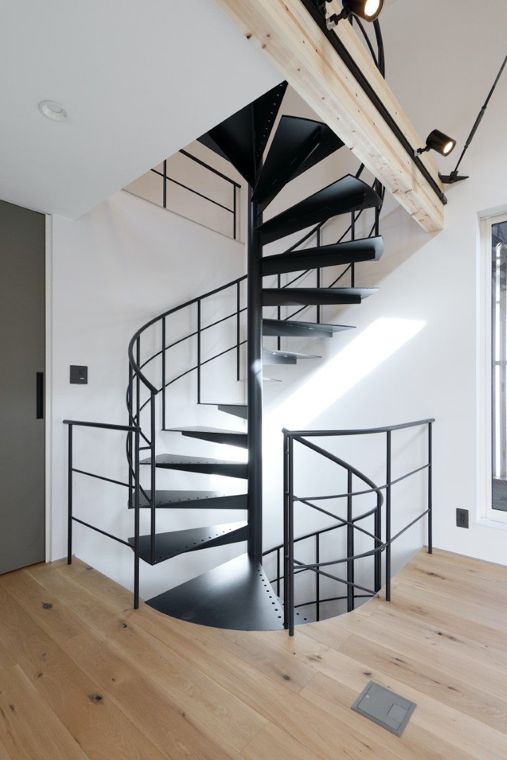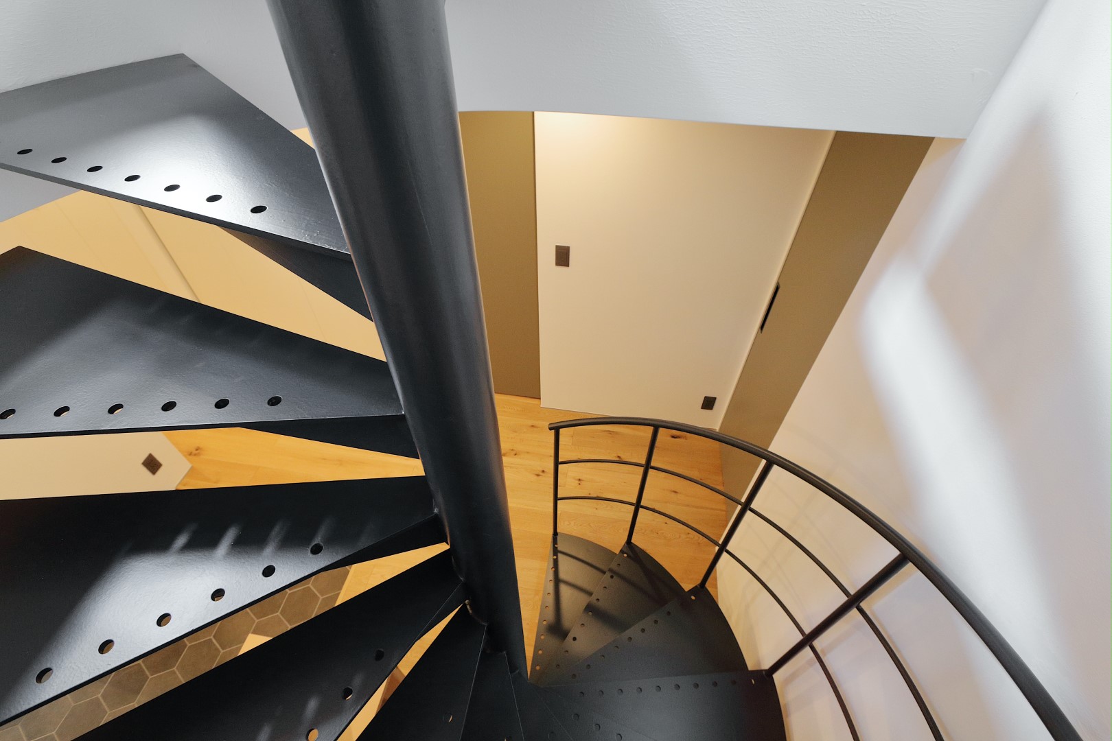 建物は本来「四角」や「直線」で形成されるものが多いため、螺旋階段特有の丸みが非常に印象的で、室内の雰囲気を柔らかくする効果もありますので、お好みの方もいらっしゃるのではないでしょうか?