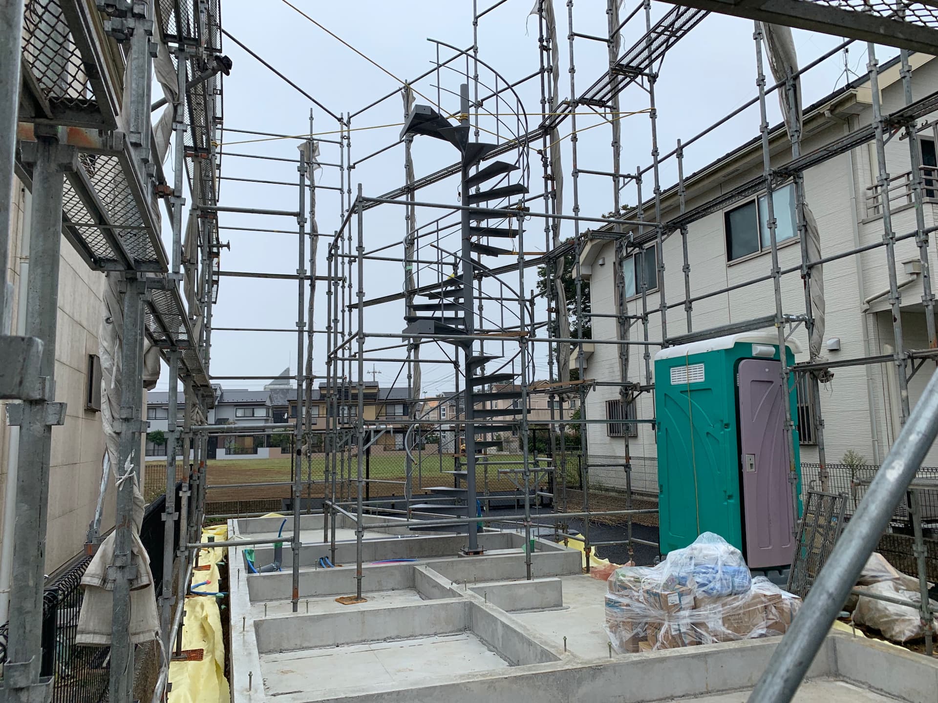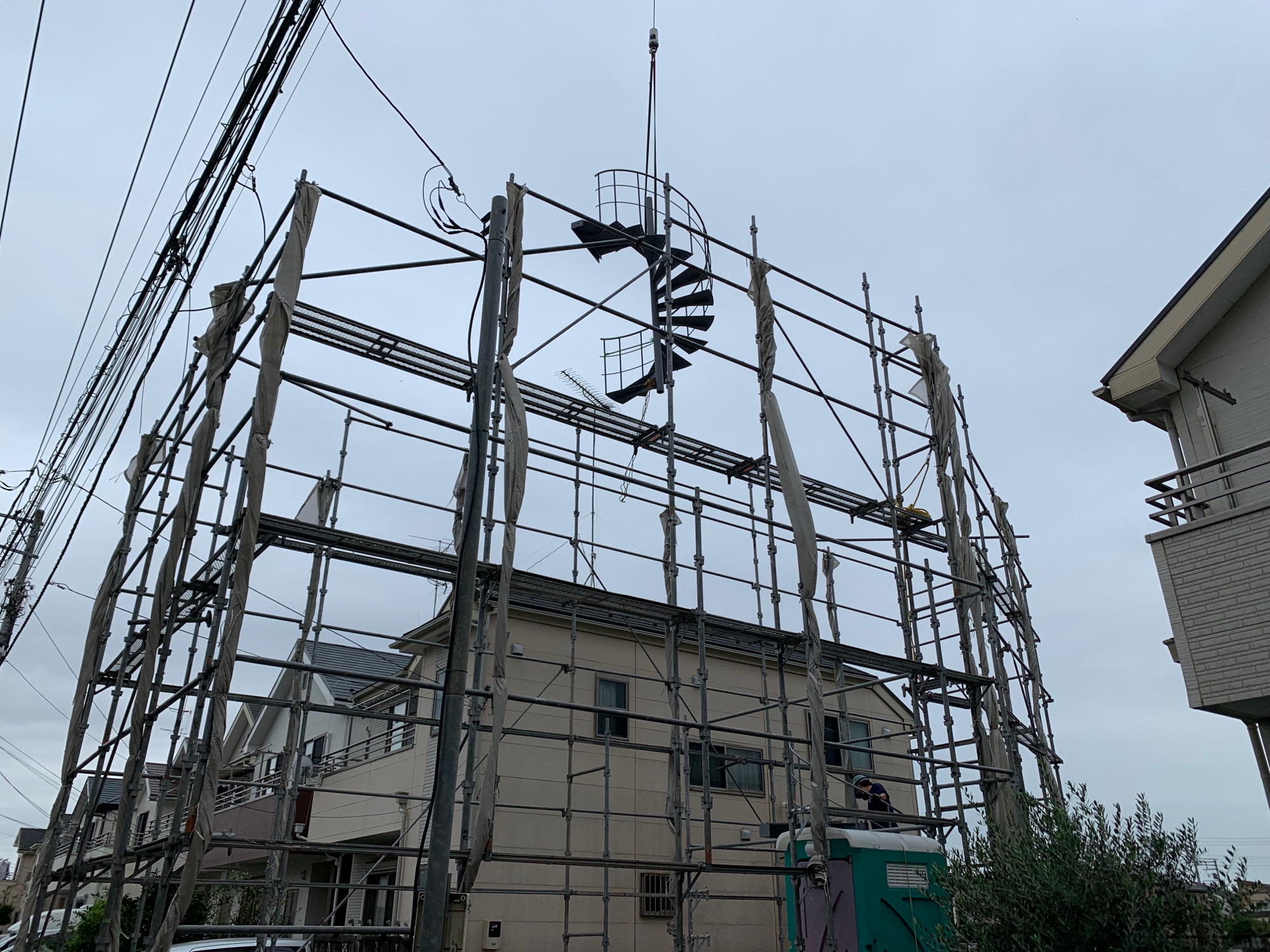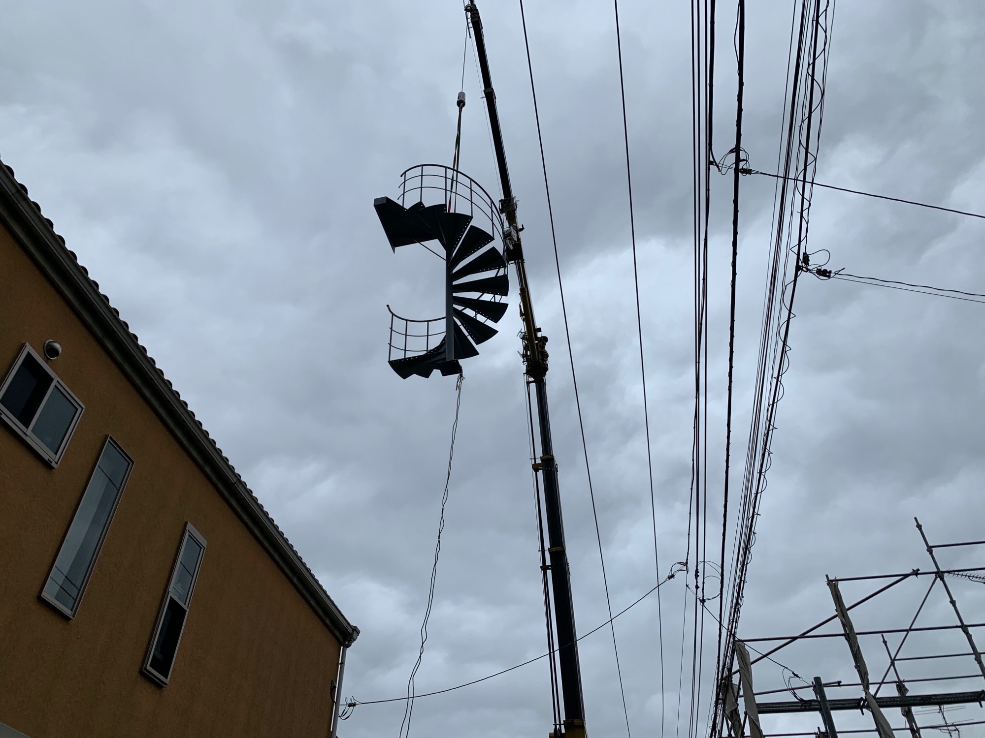 基礎完了後、足場を設置した後、通常はすぐ上棟なのですが、先に螺旋階段を持ってきます。