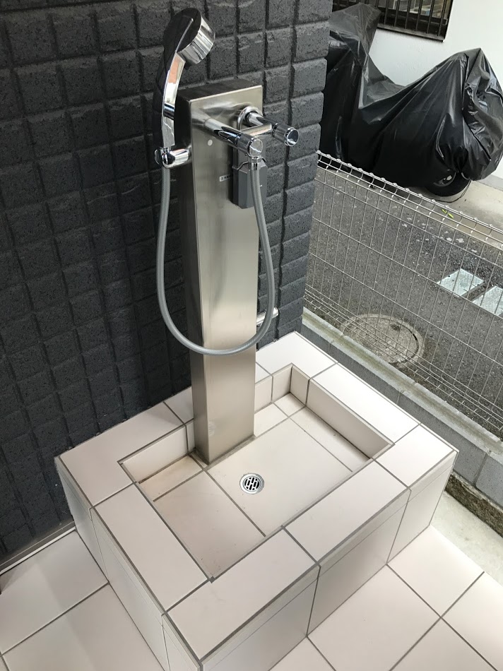 散歩から帰ってきたときにワンちゃんを洗ってあげる水栓です。スタイリッシュで立派です。
