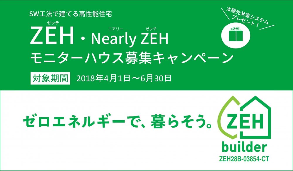 キャンペーン期間中に、SW工法によるZEH仕様もしくはNearly ZEH仕様いずれかにて工事請負契約を締結し、①②いずれかに該当する方 ①2018年10月末までに建物着工が可能な方 |