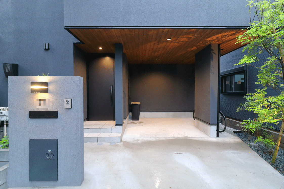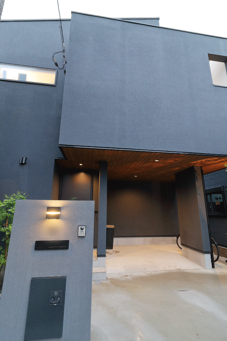 外観は黒をベースに木の軒天をアクセントに加えました。 |