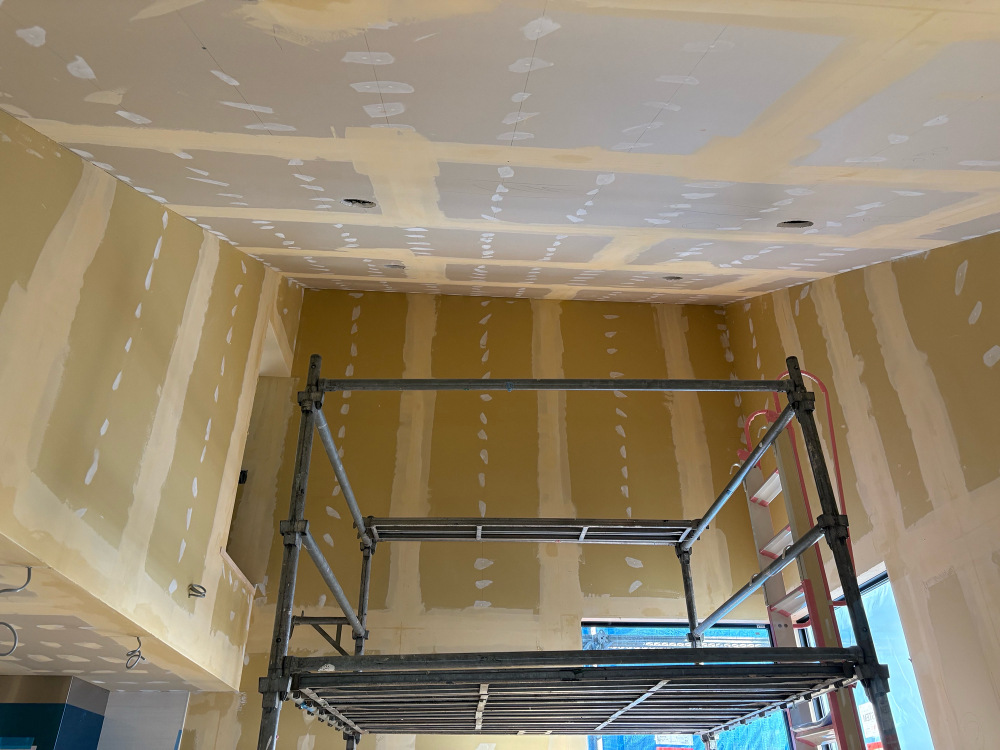 クロスを張る前処理としてボードの継ぎ目やビスのところへパテ処理をし平にする作業を行っています。