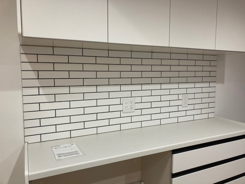 本日、カップボードと吊り戸の間にタイルを貼りました。