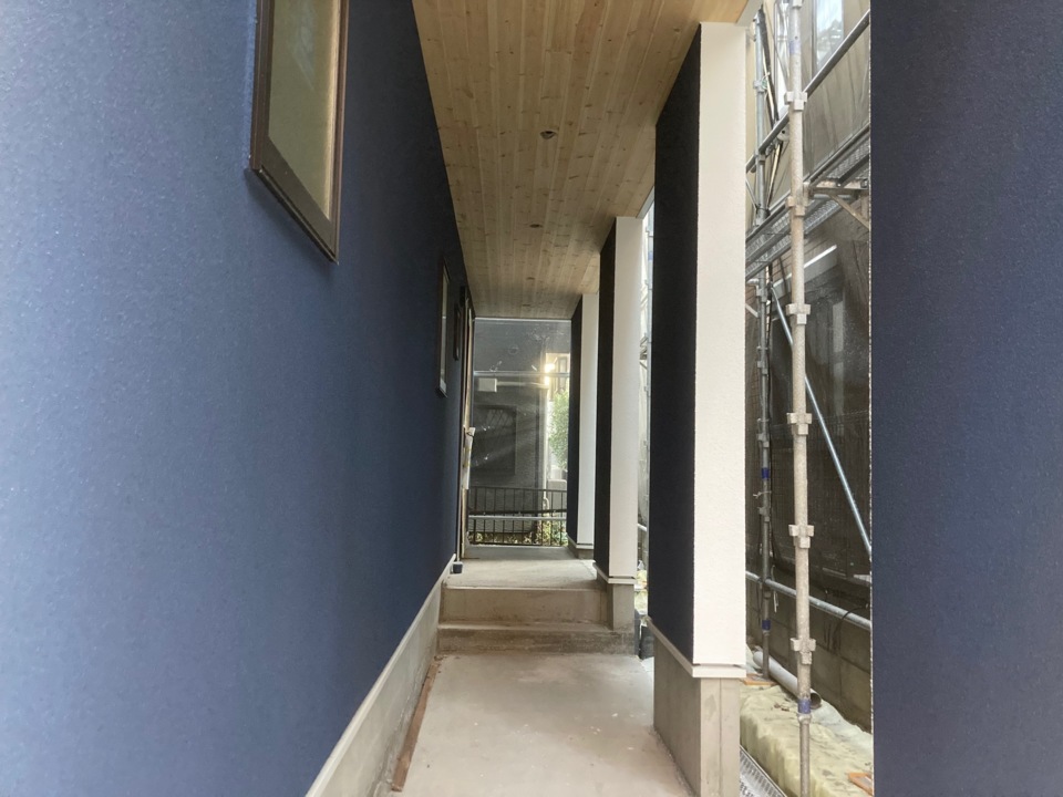 玄関ポーチは、アクセントの青色で吹付けされています。