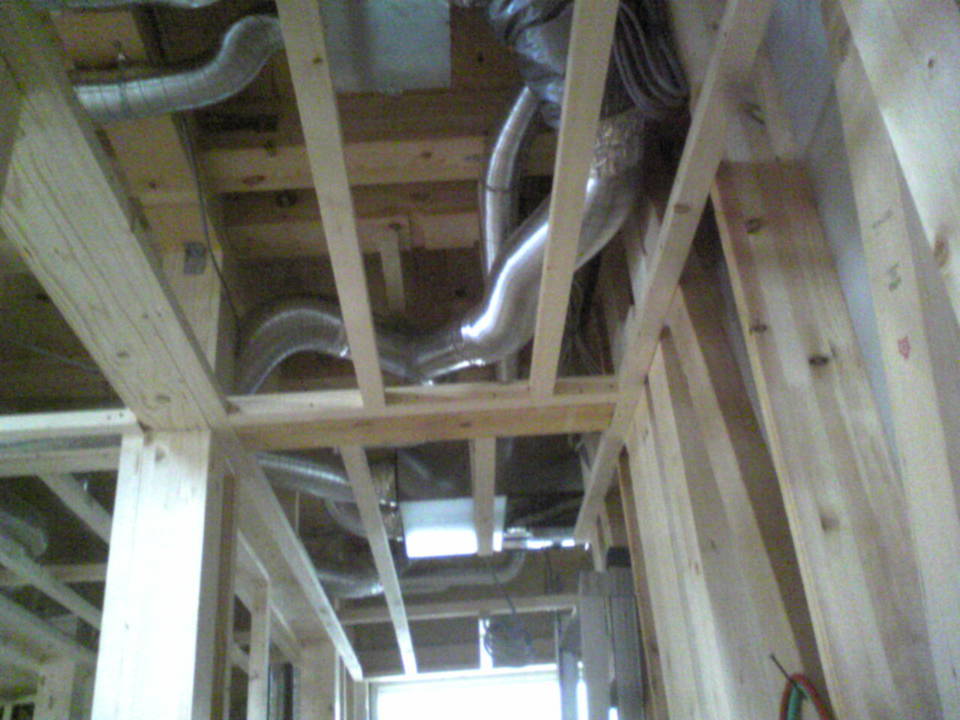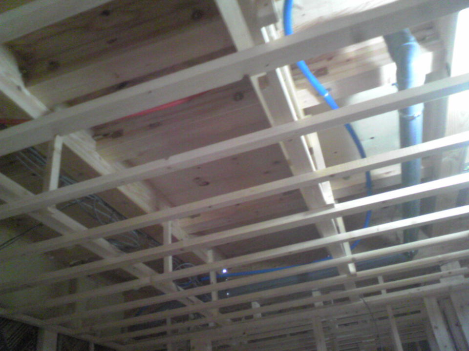 電気配線・給排水配管工事が完了し大工さんによる、天井下地組みが始まりました。