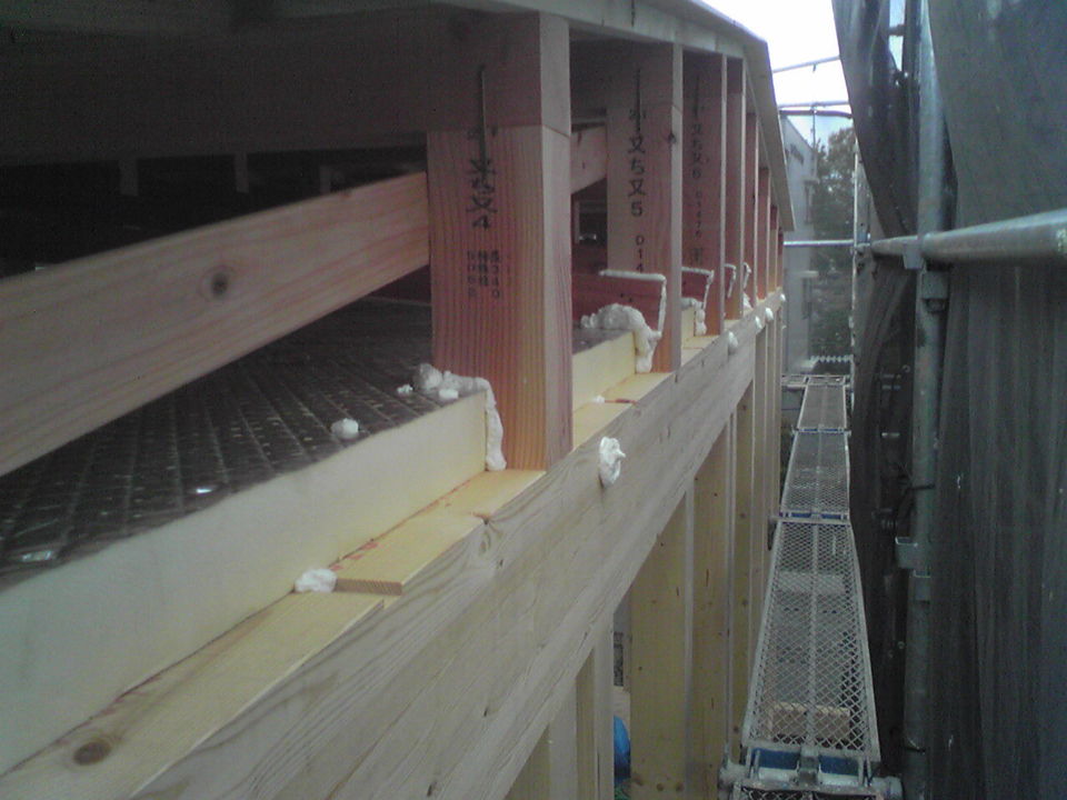 気密性を保つ為、外壁部分のプレカット材を接合しているボルト関係の金物部分(隙間部分も含む)をウレタンフォームにて吹付、乾燥したら綺麗に削って行きます。