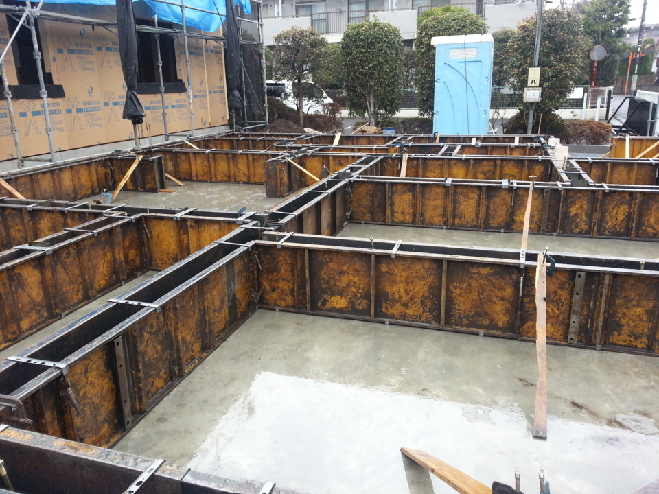 耐圧盤の上に立ち上がりコンクリート用の金属枠を設置して打設日を待ちます。