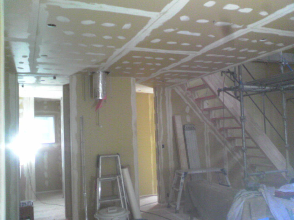 石膏ボードのジョイント・ビスの打ってある部分の下地処理(パテ)を行いクロスを貼っていきます。