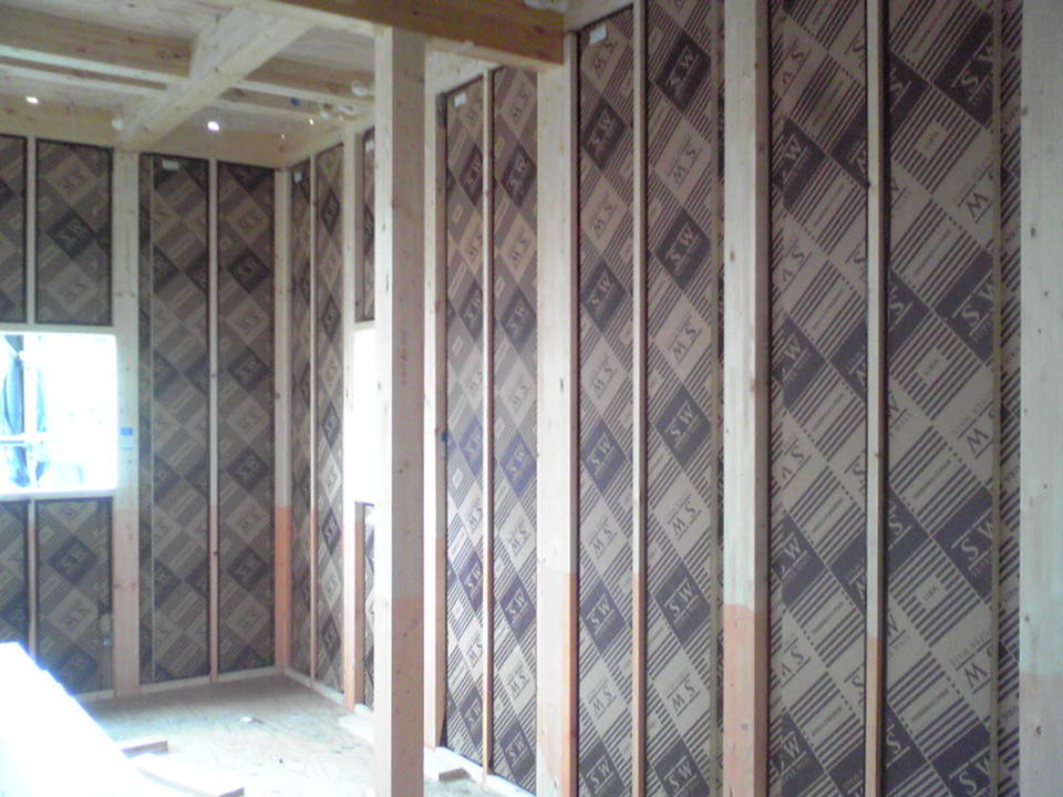 外壁下地パネルと断熱材が一体化された部材と2階天井に先行断熱材パネルを施工し、気密性タップリの工法となります。