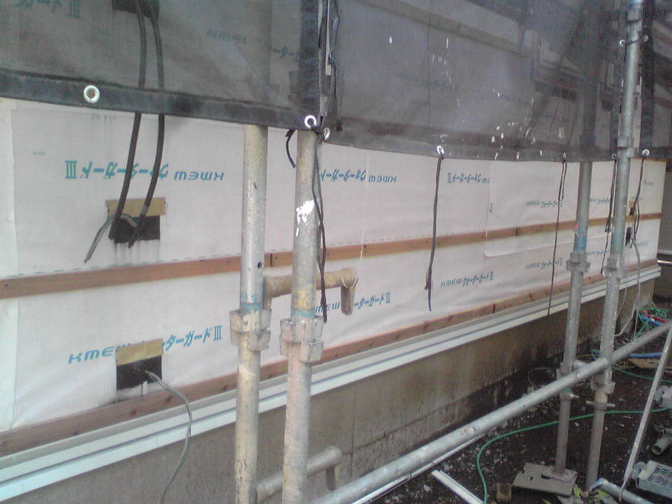 透湿シートを貼り、胴縁、水切りを取付、サイディング板を張り進めていきます。