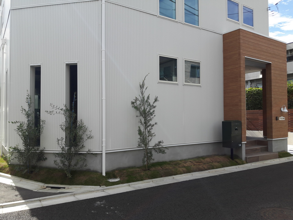 今回は角地の敷地(隅切り有り)形状に添って建物がギリギリまで配置されているので