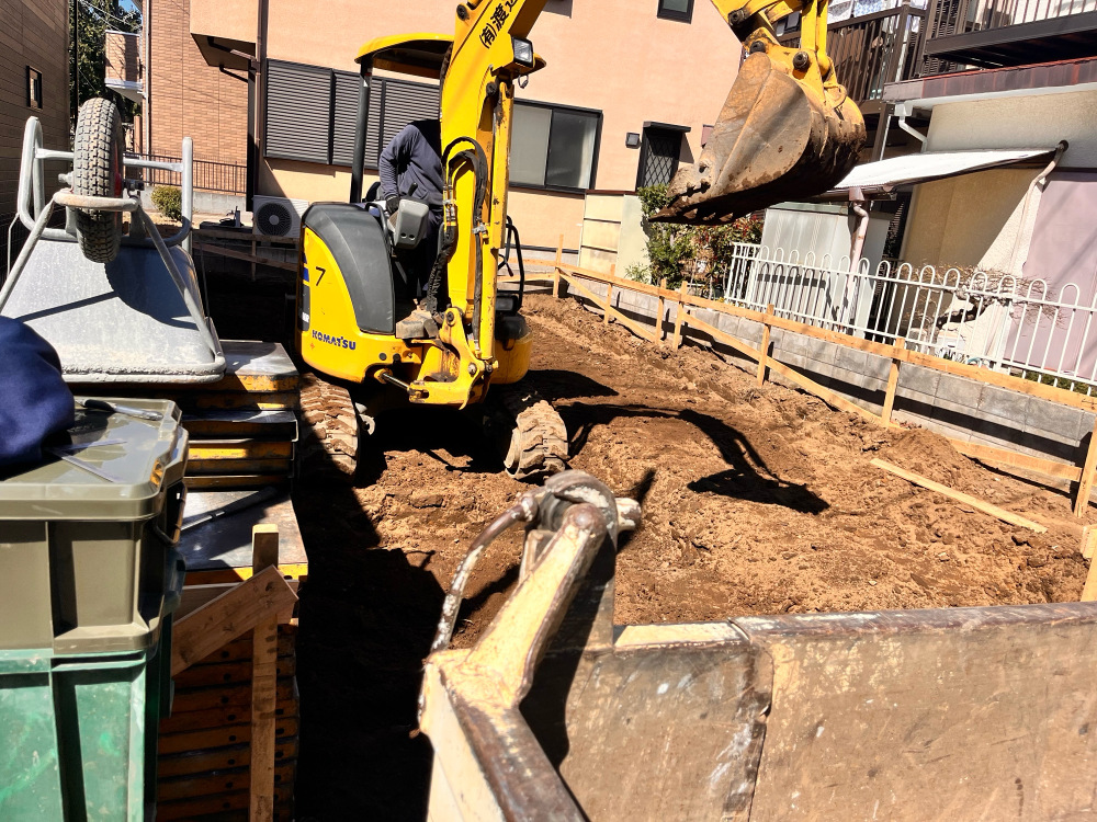 根伐りとは、基礎の形状、高さなどを考慮しで重機で地盤を掘り進める作業です。