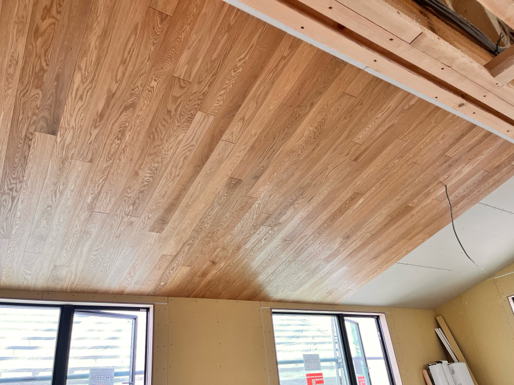 天井の板張りの施工中です。
