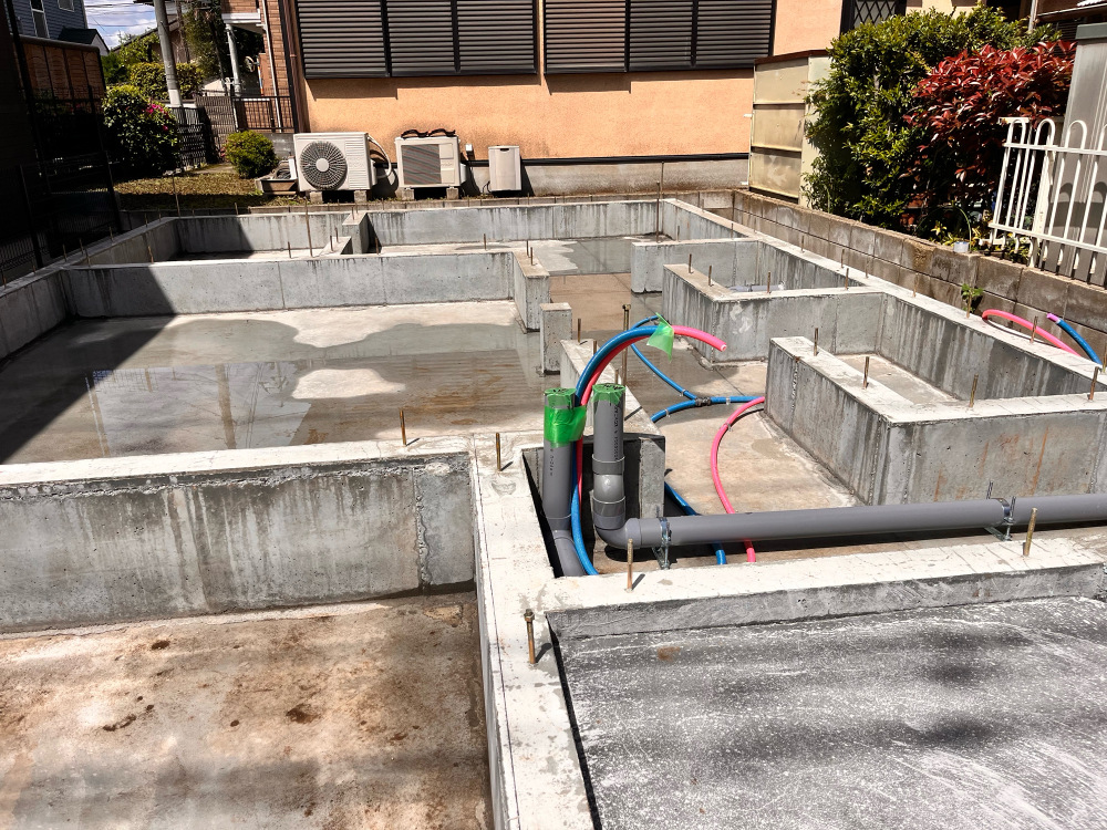 基礎完了後の給排水先行配管をおこないました。