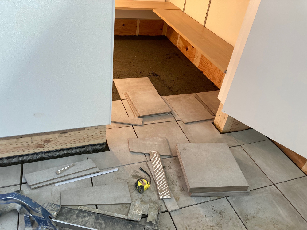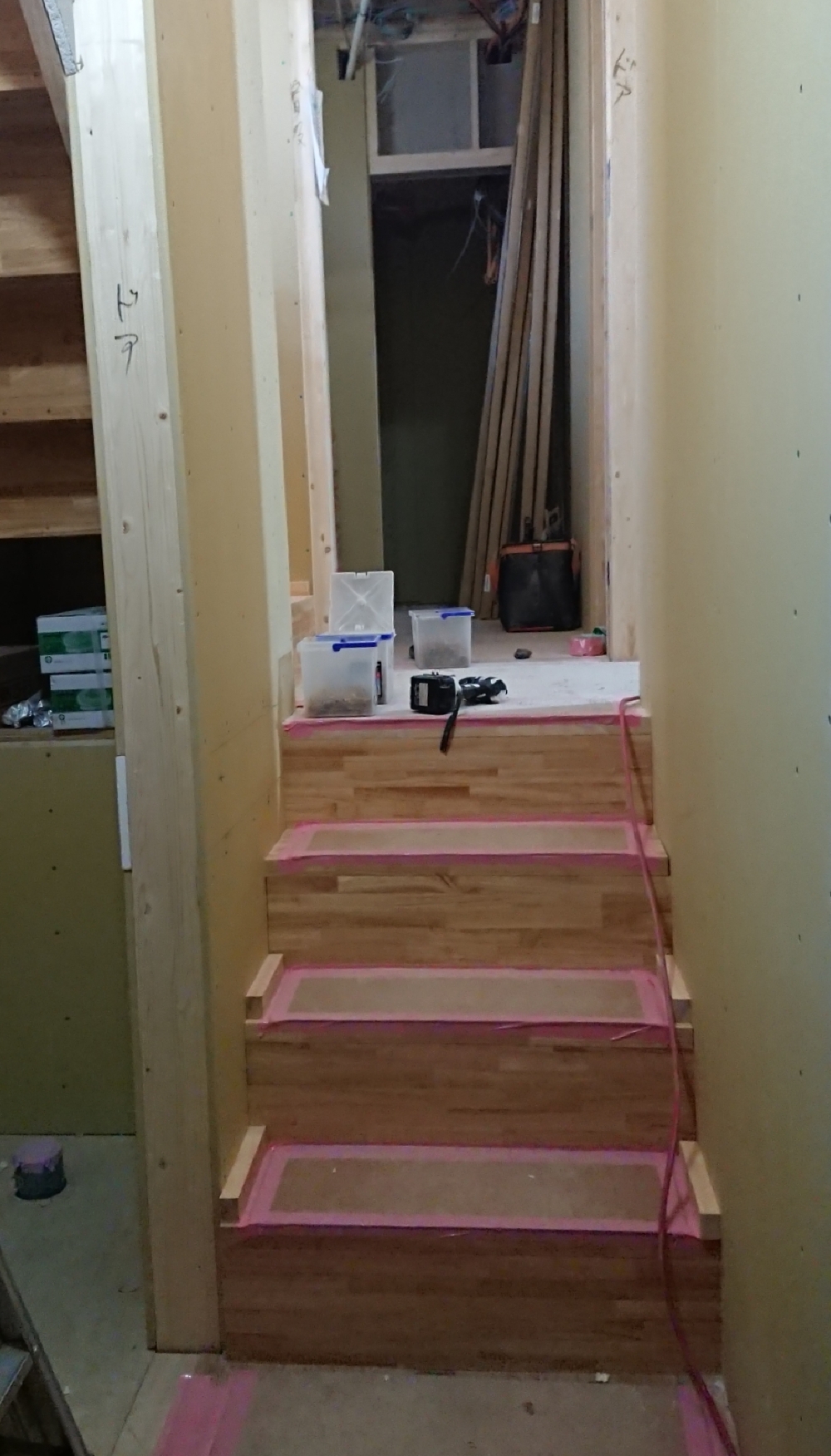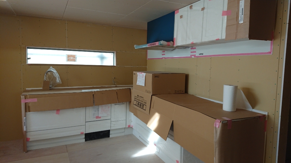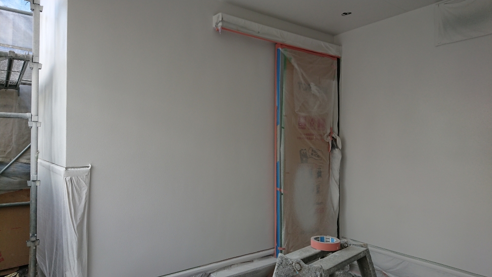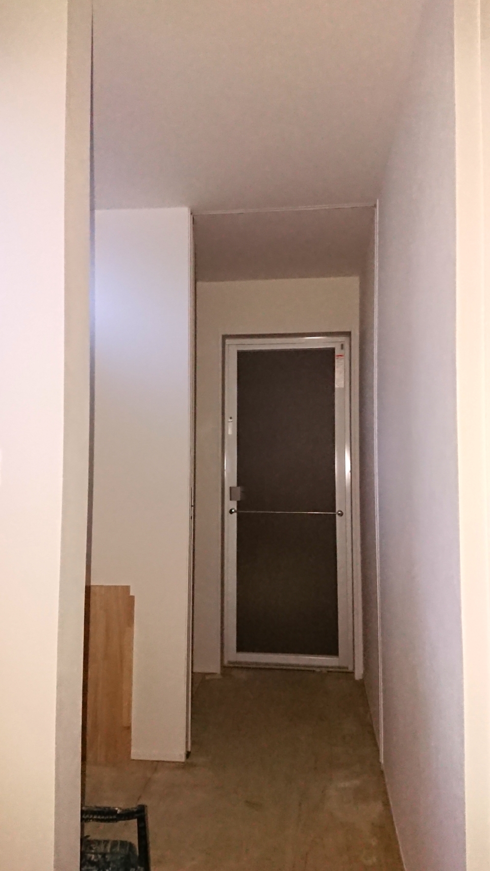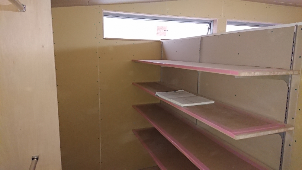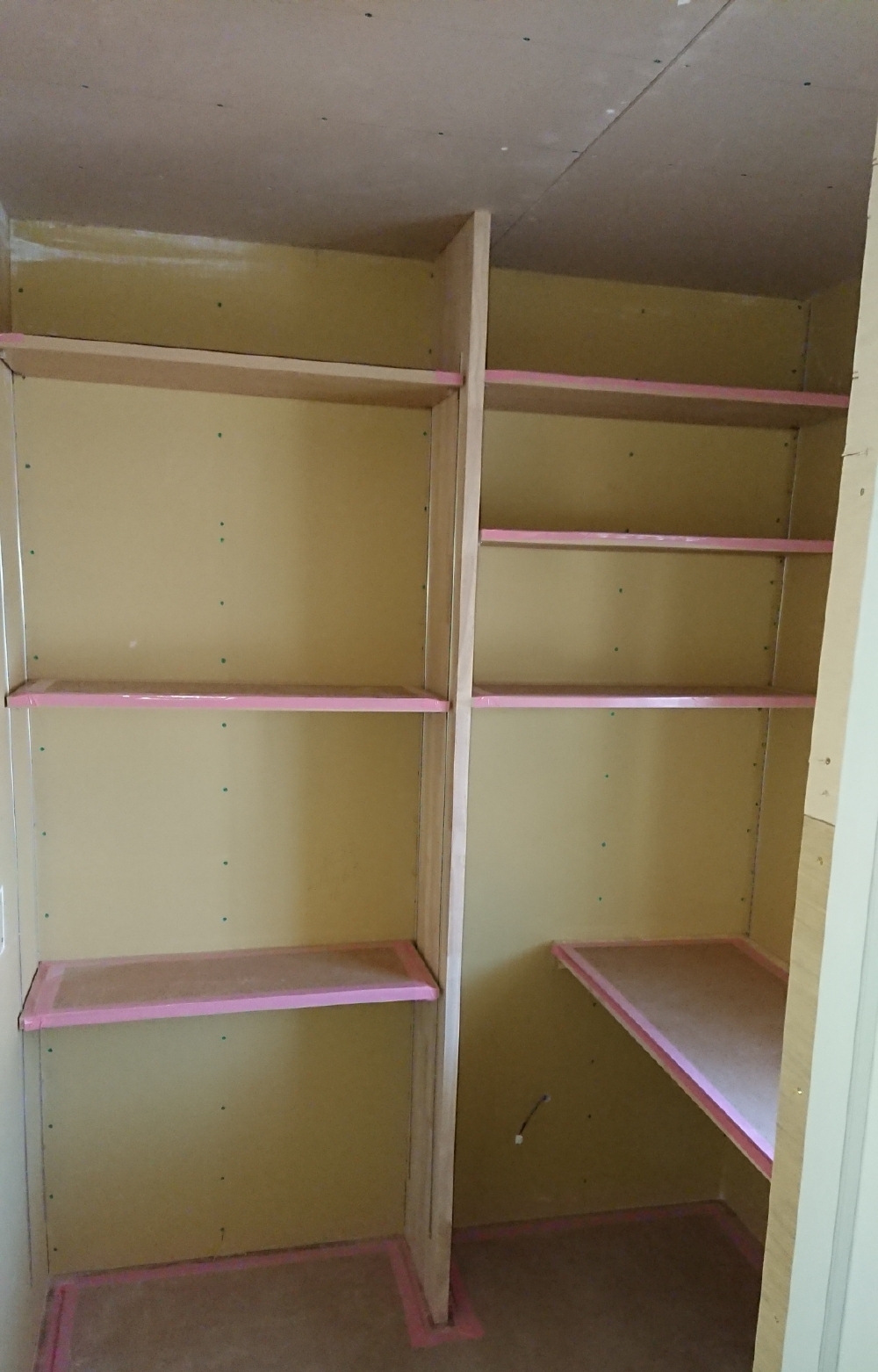 石膏ボードの施工が終わり、各部屋の棚を製作しています。