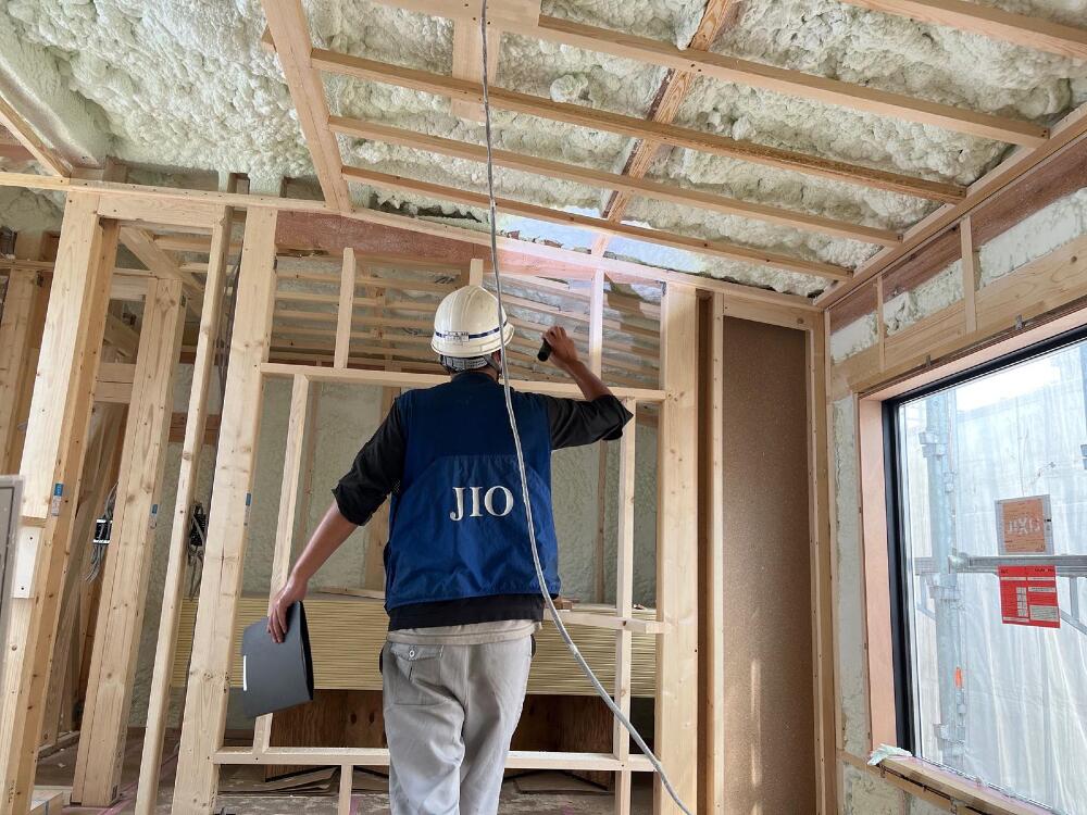 8月1日に吹付け断熱工事を行い、本日は吹付け断熱工事の施工状況を第三者機関に確認していただきました。