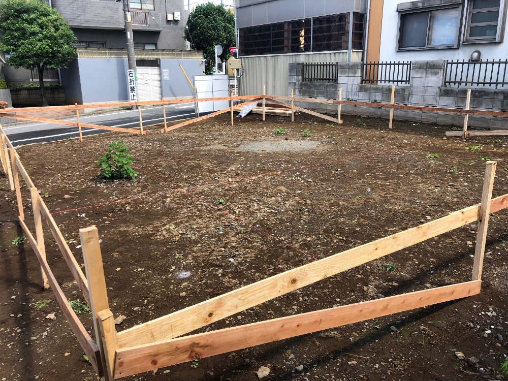 やり方とは、基礎工事の前に、柱や壁などの中心線や水平線を設定するため、杭を打ってつくる仮設物のことです。