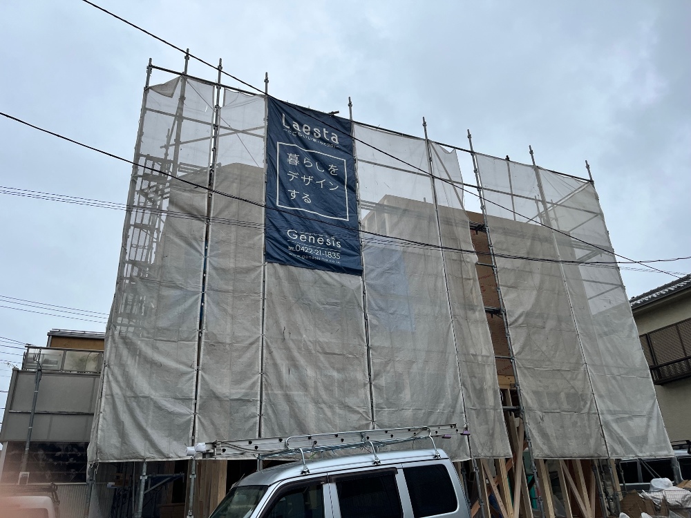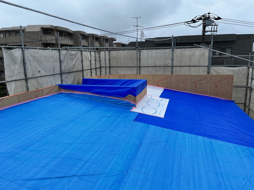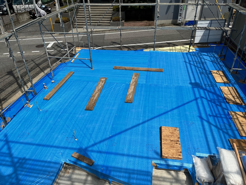 写真の野地板は、雨に濡れない様に養生をしてあります。