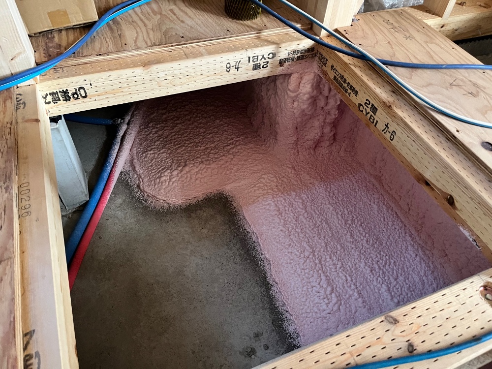 本日、基礎の吹付断熱工事を行いました。