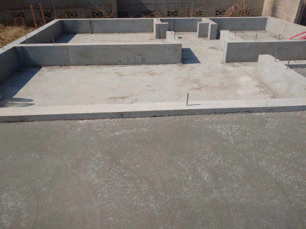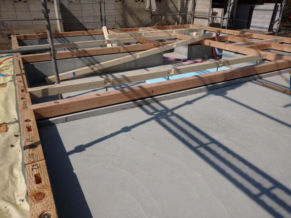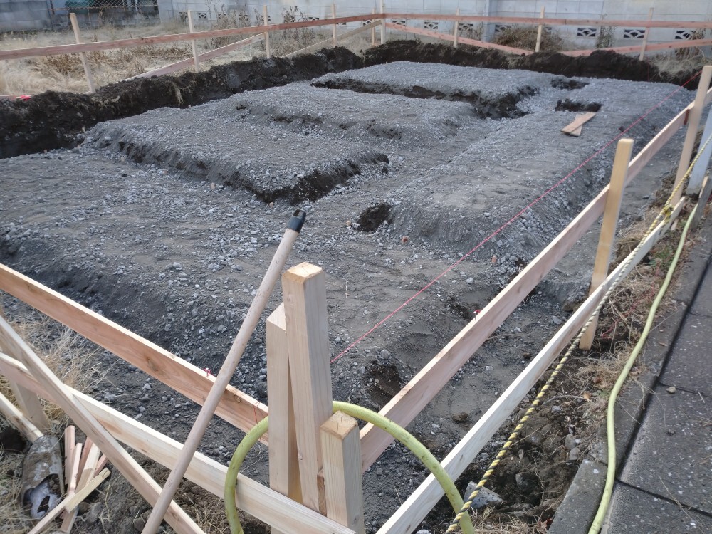根伐りにて床付けを作成し、家価値60の土壌処理を行い、防湿シートを施工、捨てコンを施工します。