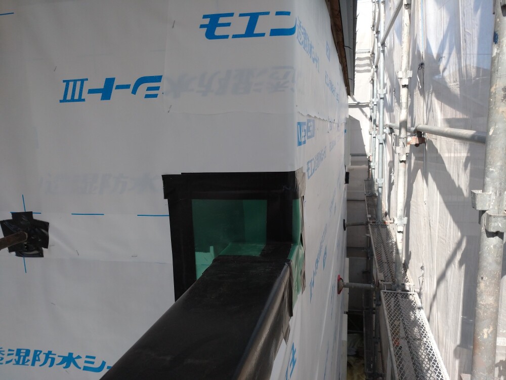防水シートの重ね代・外壁貫通部の防水処理・サッシまわりの防水テープの施工状況のチェックを受けます。
