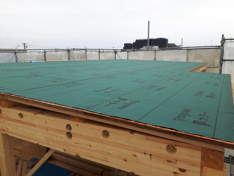 ルーフィングとは屋根の下地材(構造用ベニヤ)を施工した上に張り広げる防水シートのようなものです。