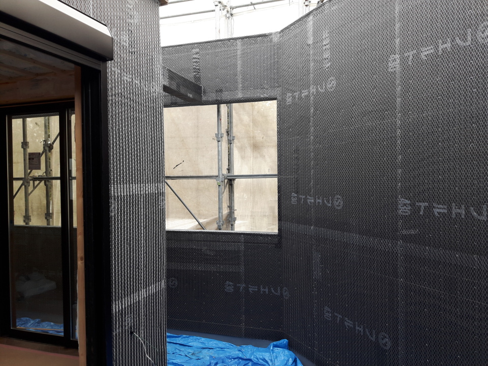 ラス網は外壁のモルタルを塗る下地となり、いよいよモルタル塗りの開始となります。