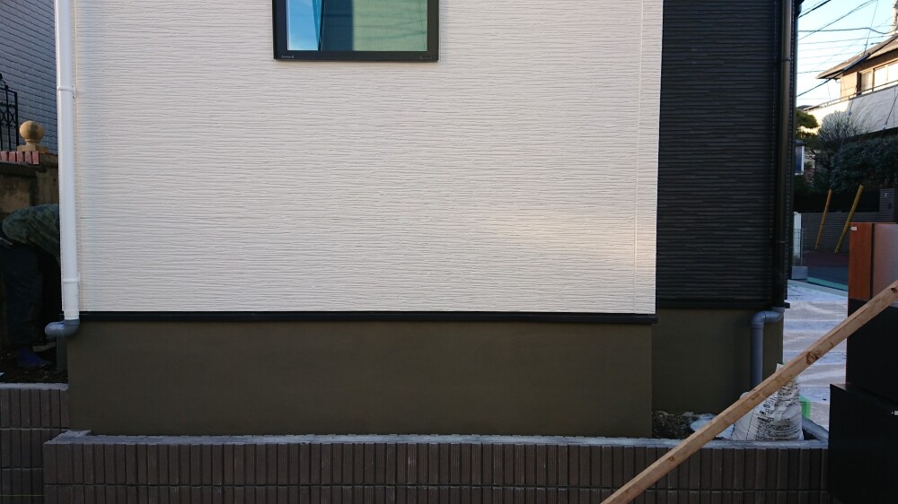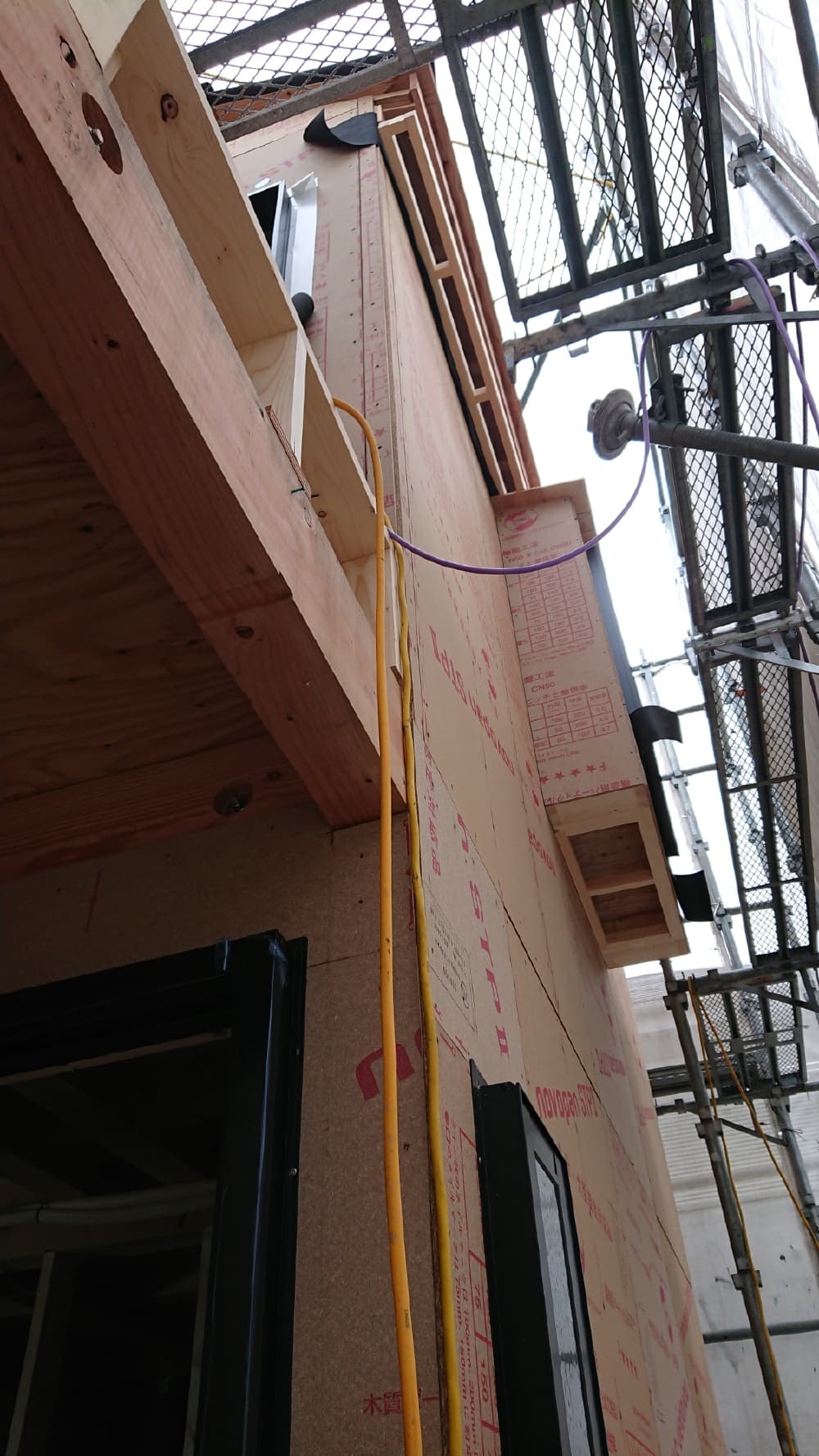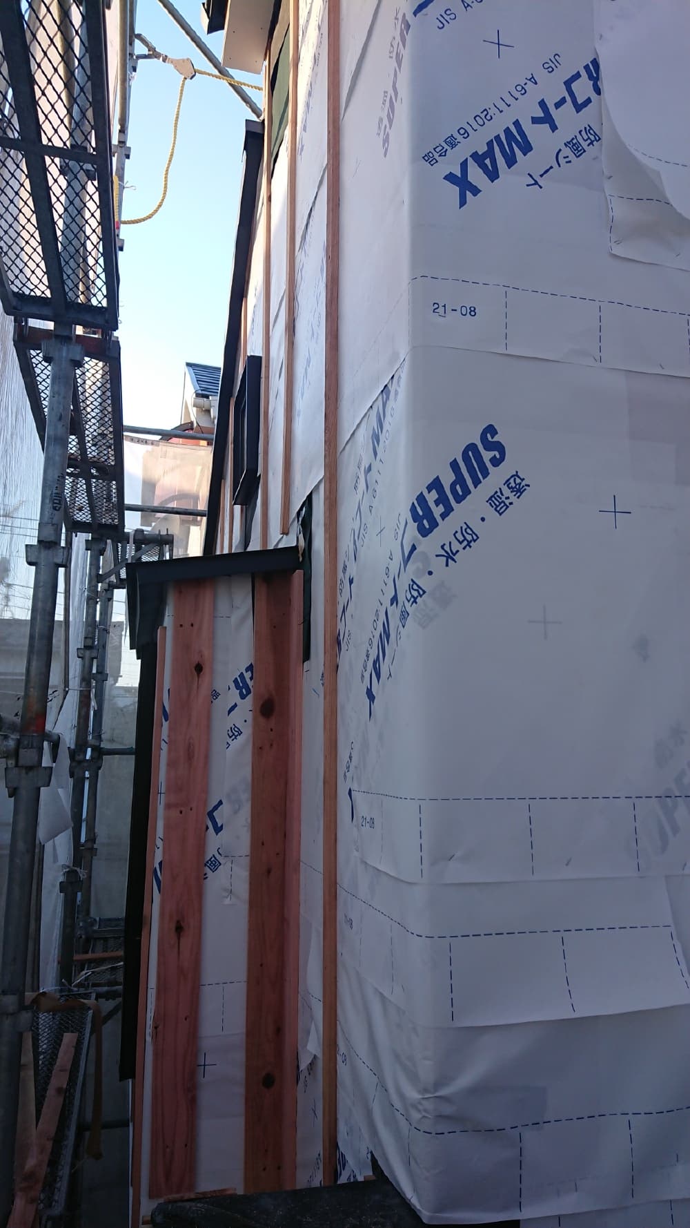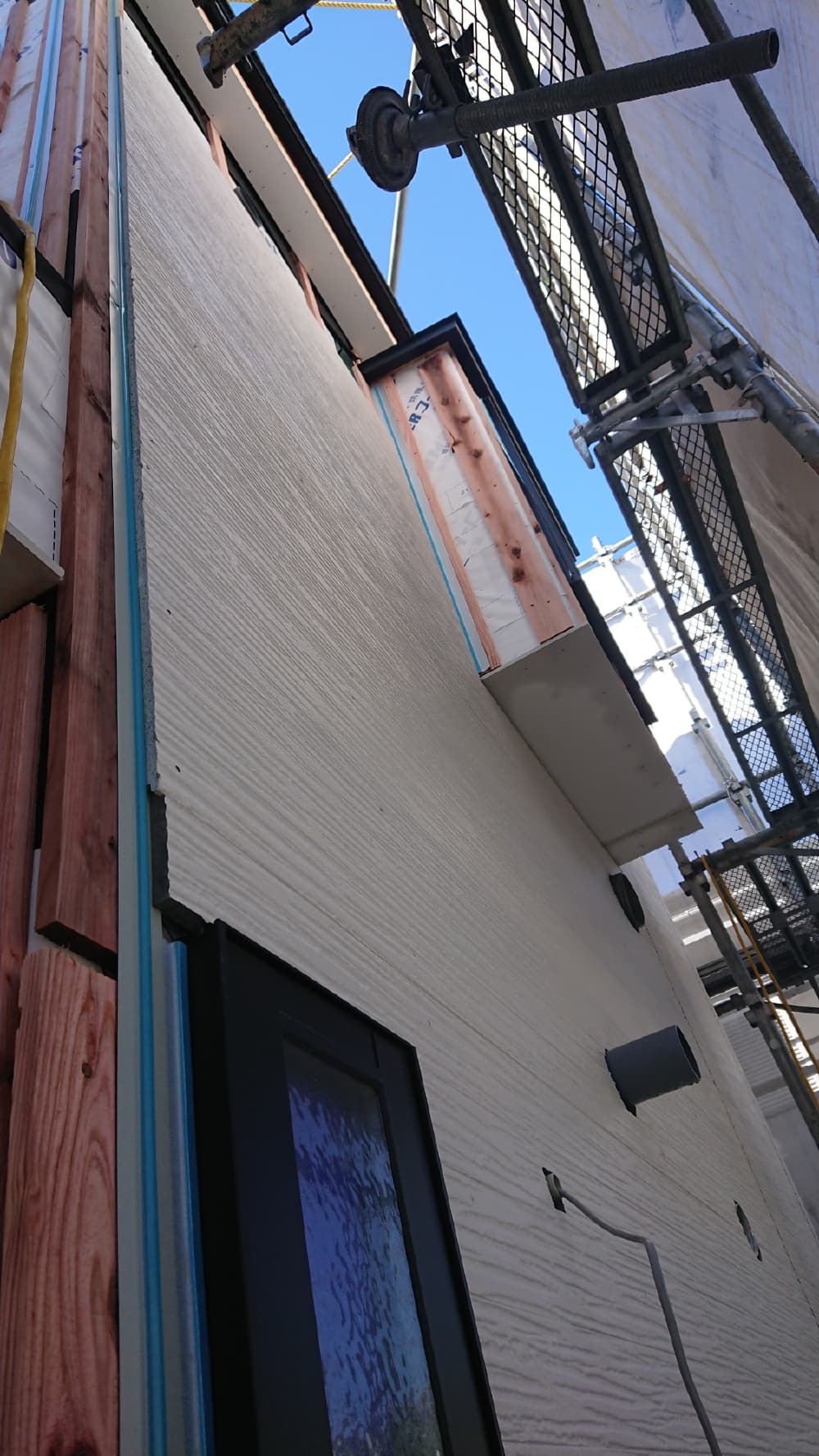 サイディングと呼ばれる建物の外壁に使用する仕上げ用の板材を取り付けていきます。