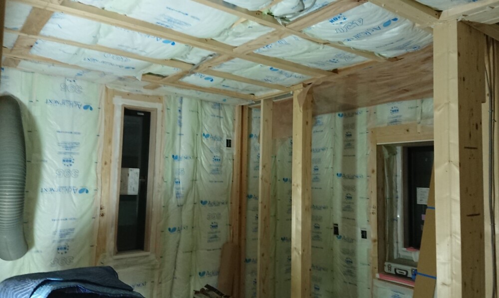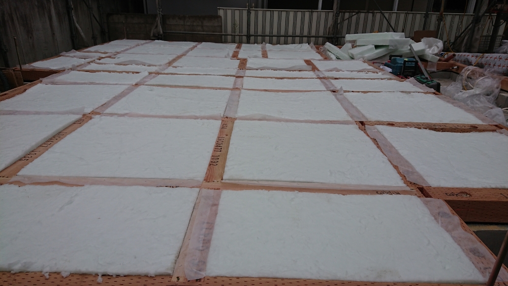 グラスウールと呼ばれる断熱材を天井と壁前面に貼ることで断熱および機密効果を得ることができます。