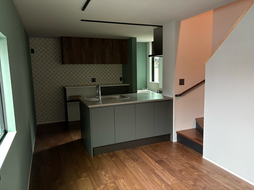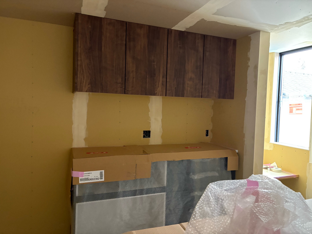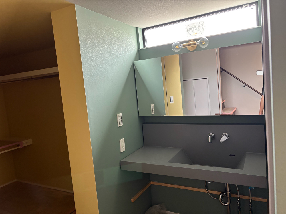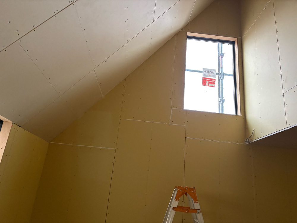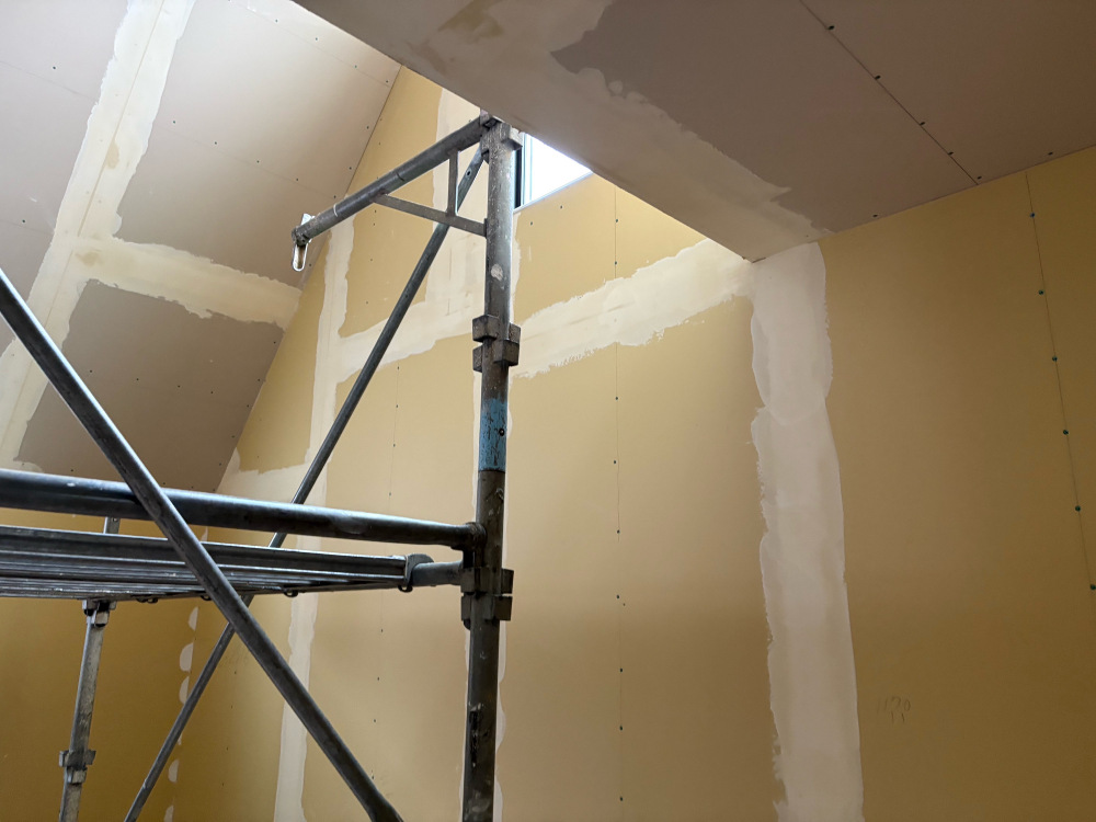壁紙を貼る前に下地処理をします。石膏ボードの繋ぎ目の部分にパテを埋めて、ペーパーをかけ段差ができないように平らにしていきます。