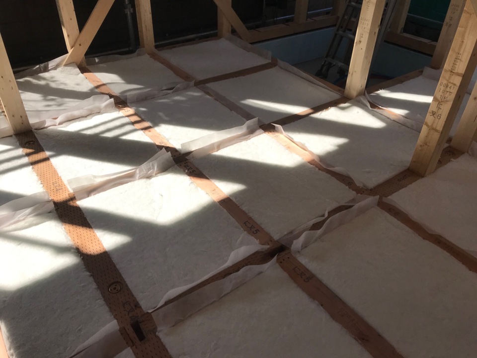 本日、床断熱材入れをおこないました。断熱材は、アクリアUボードというボード状グラスウールです。土台、大引き材の間にはめ込み固定します。断熱等性能等級の最高レベルである等級4の性能がある断熱材です。