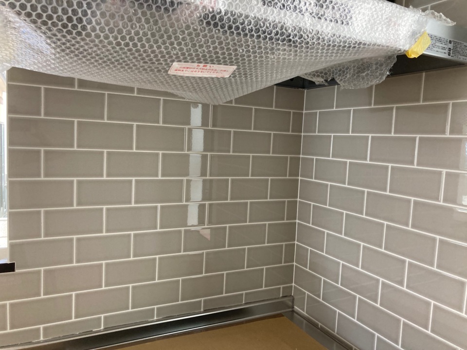 本日、キッチンまわりのタイル工事が完了しました。