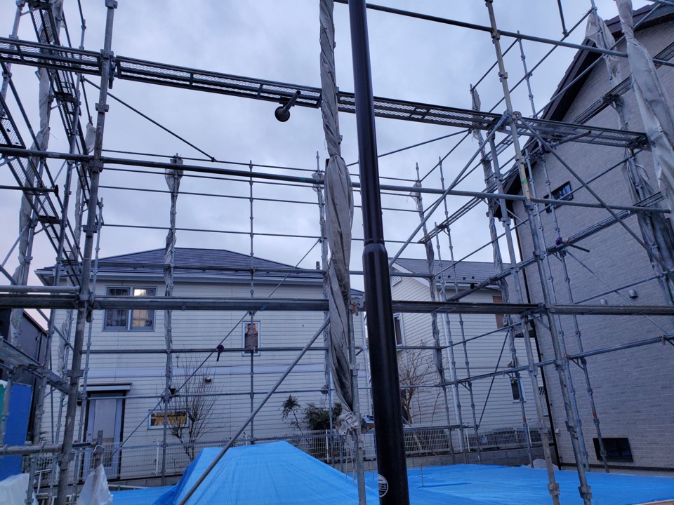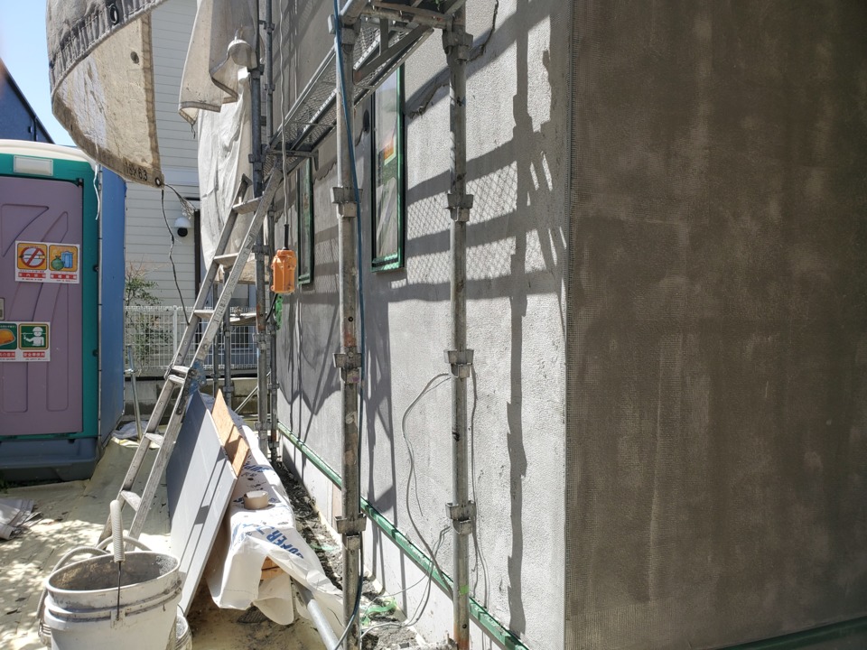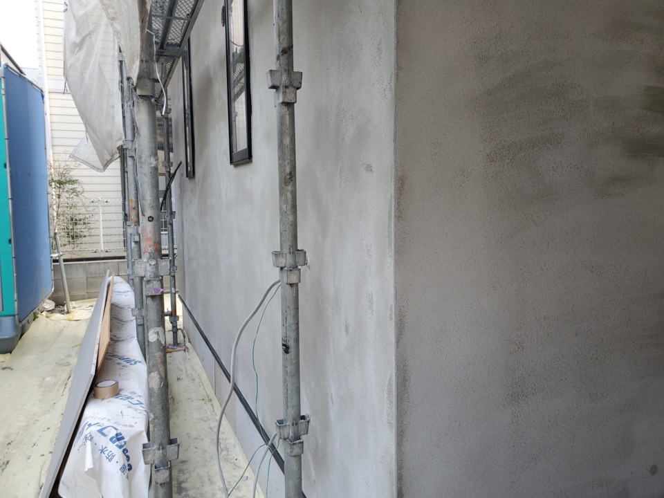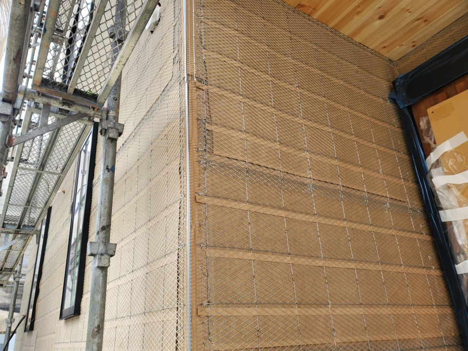外壁ですが、今回は吹付になりますので、モルタル下地のラス網施工を行いました。