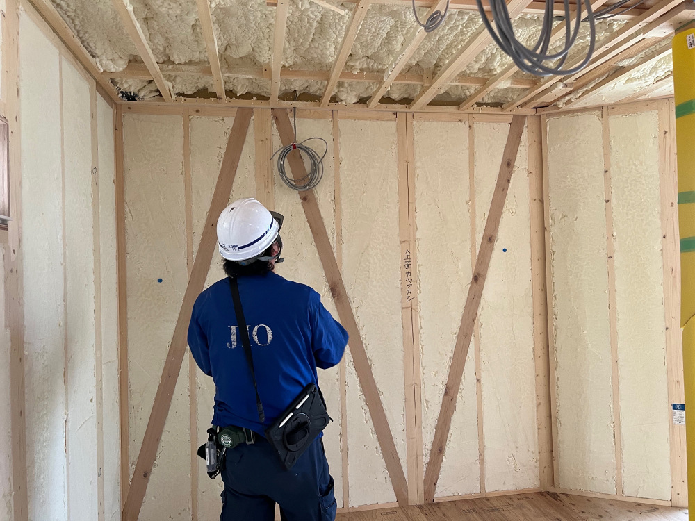 先日施工した断熱材が規定の厚みで隙間なく施工されているかチェックしてもらいます。