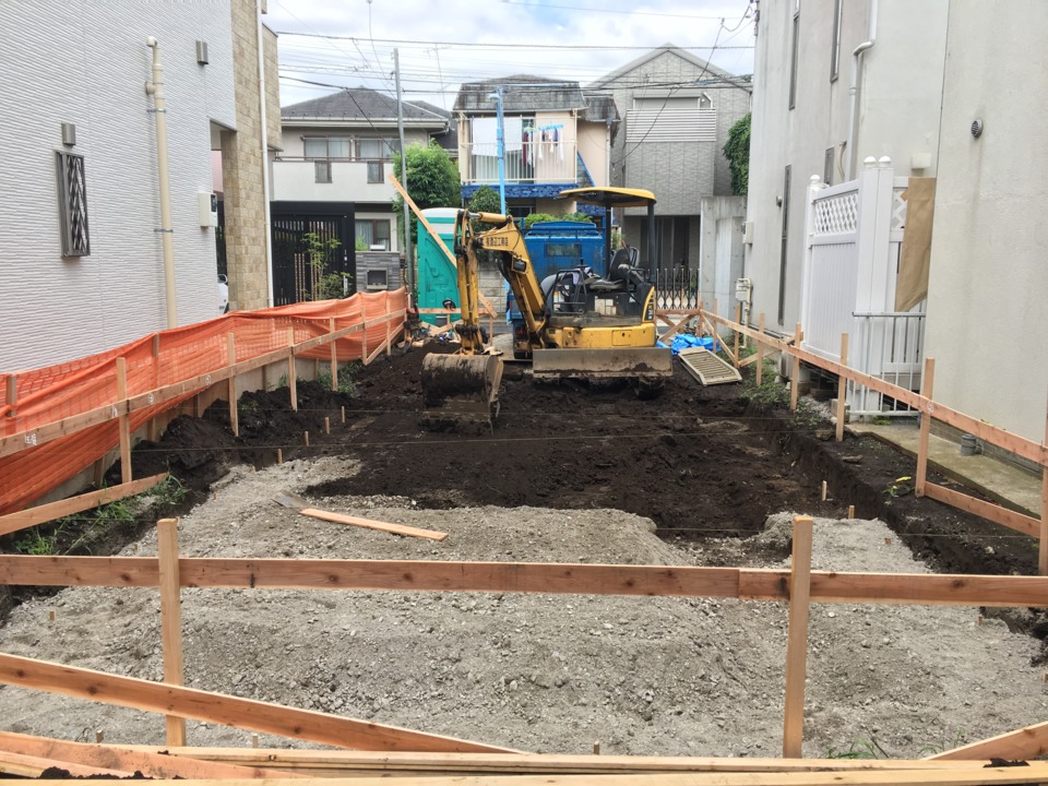 雨でぬかるんだ状態の中、苦労して遣り方を出しましたが、重機乗り込み時には天候が回復致しました。