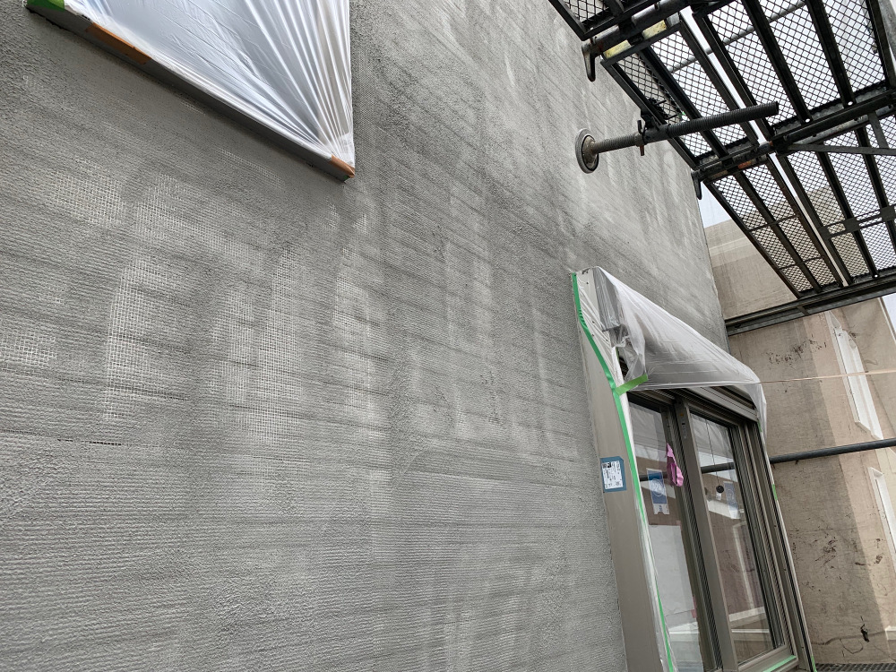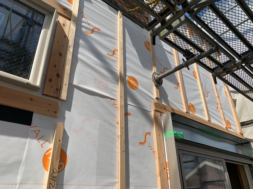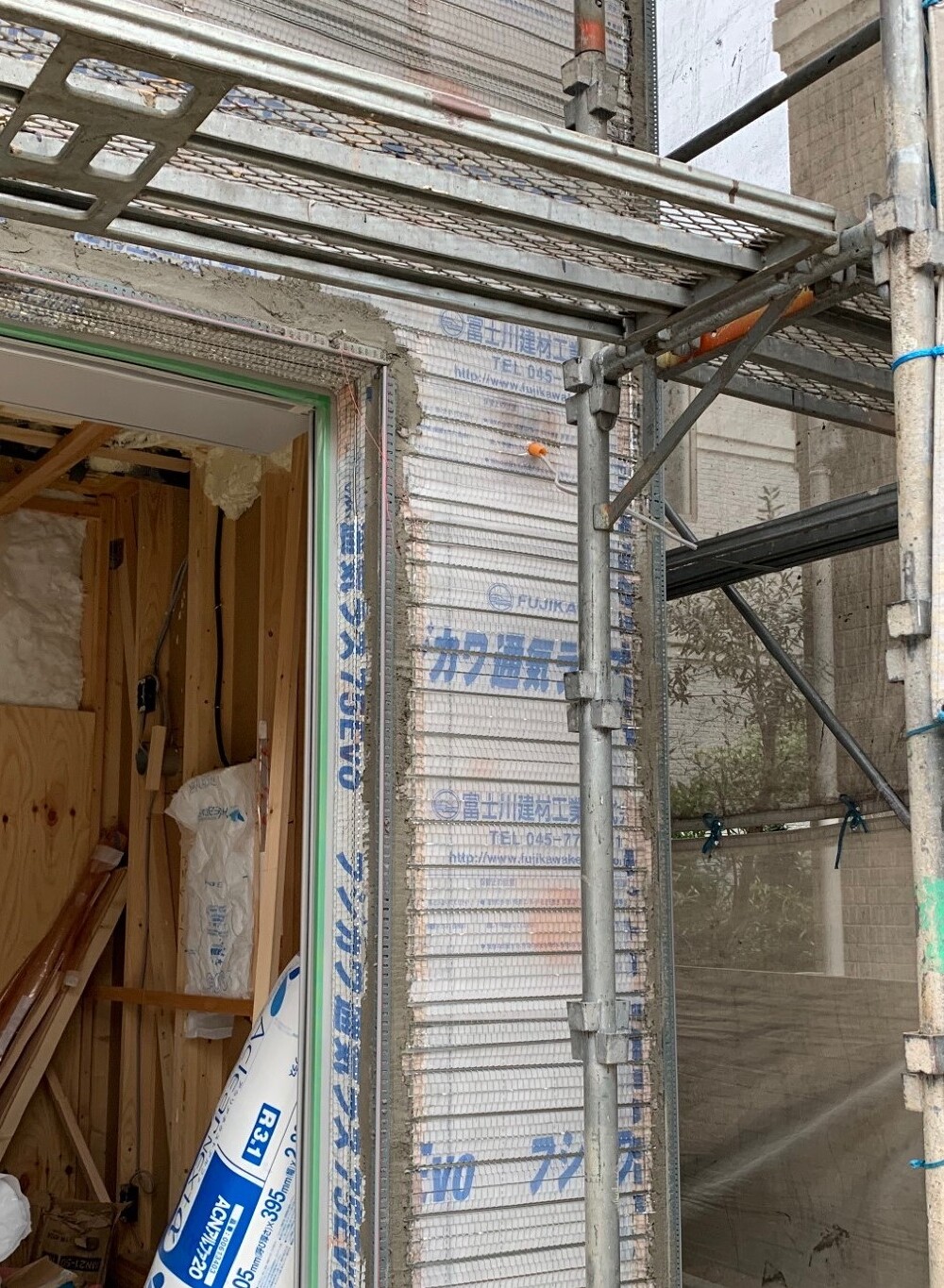 外壁下地の上にモルタルの付きをよくするためのラス網を施工しました。