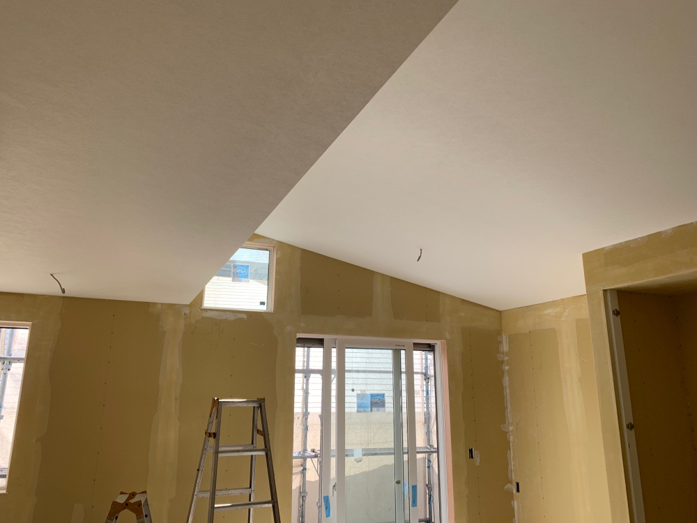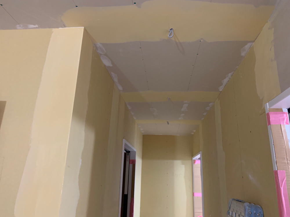 石膏ボードのジョイント・ビスの打ってある部分の下地処理(パテ)を行いクロスを貼っていきます。