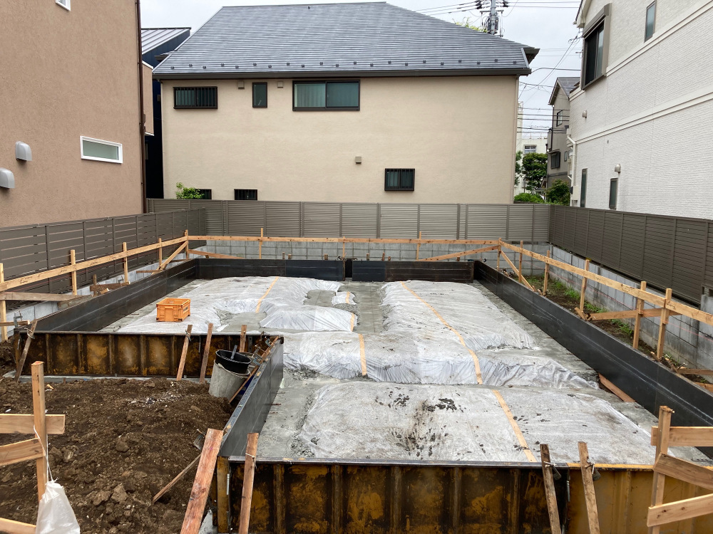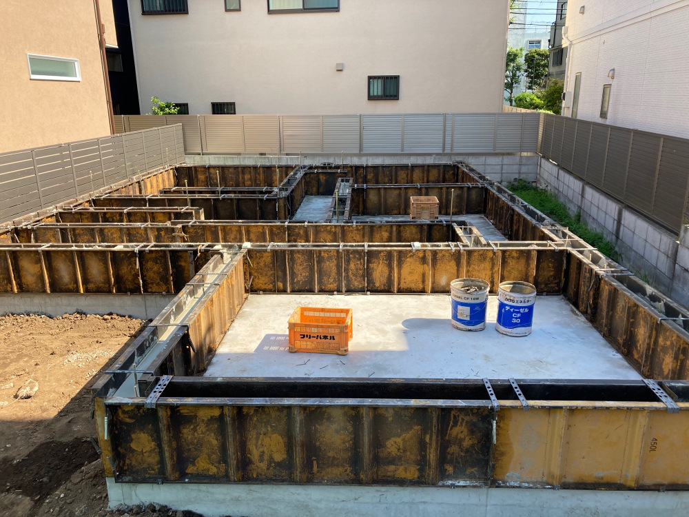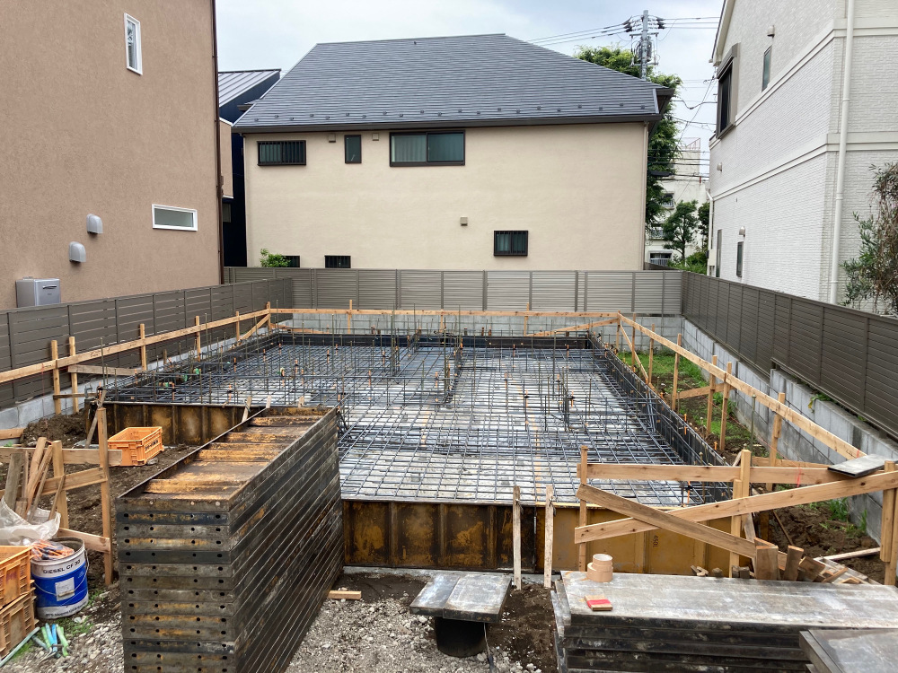 耐圧盤と呼ばれる基礎の床部分の打設が完了したので、立上りの枠組みを行っています