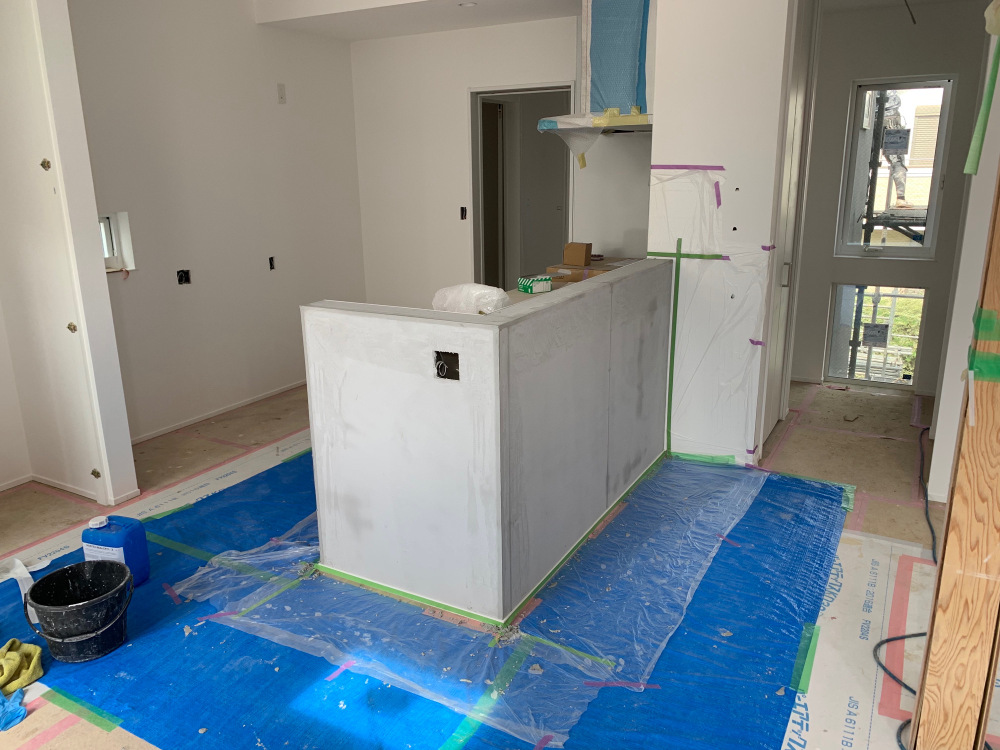 キッチンの腰壁は特殊なモルタルで施工しました。