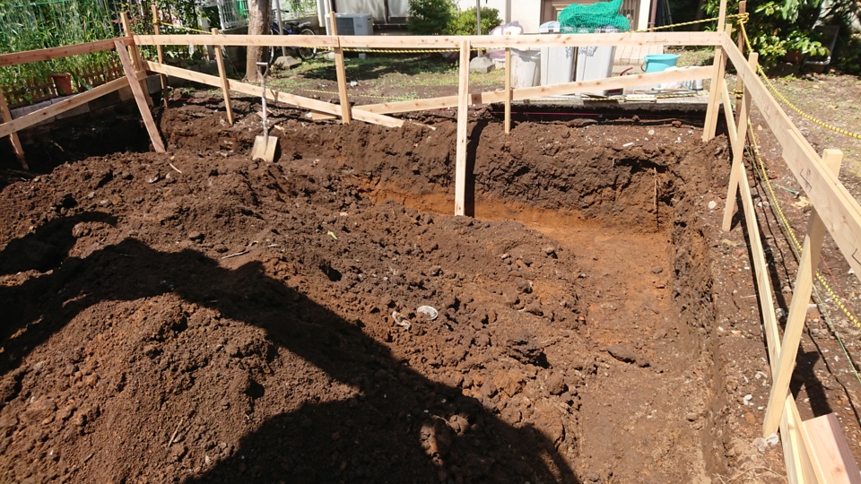 設計士作成の基礎伏図を基に地盤面からの深さや幅などを考え、地盤面を掘り進める工程です。
