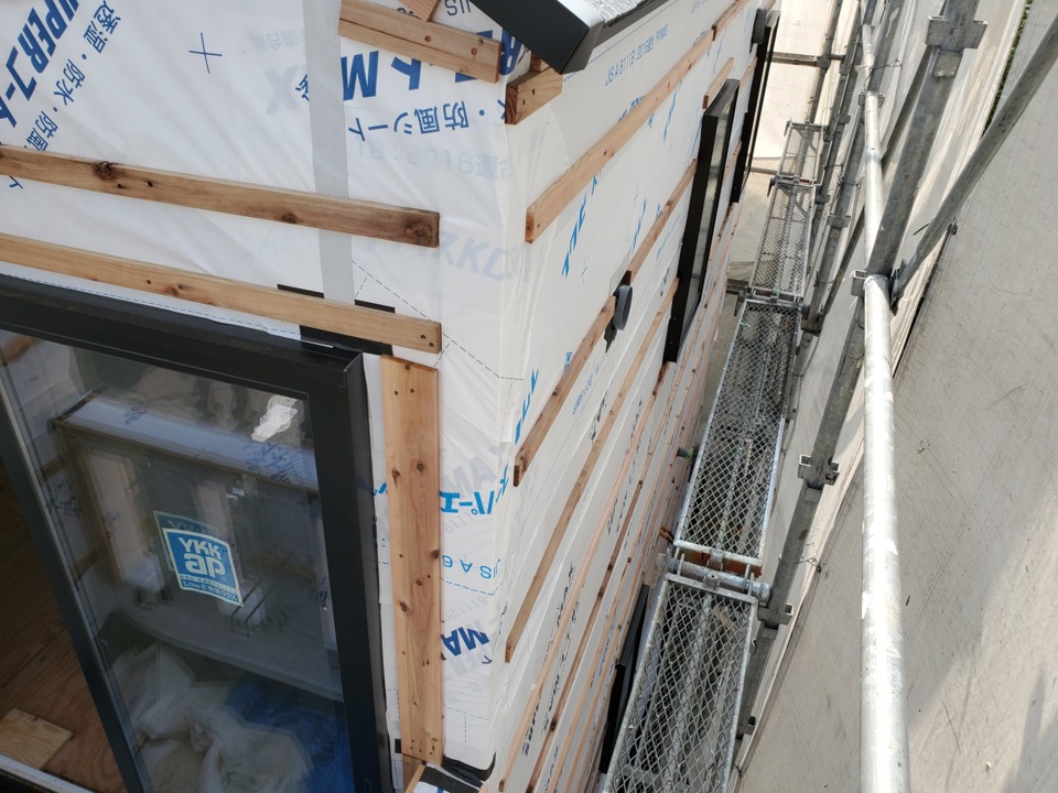 防水シートに同縁を施工し通気を取ってラス網を施工しモルタルへと進みます。